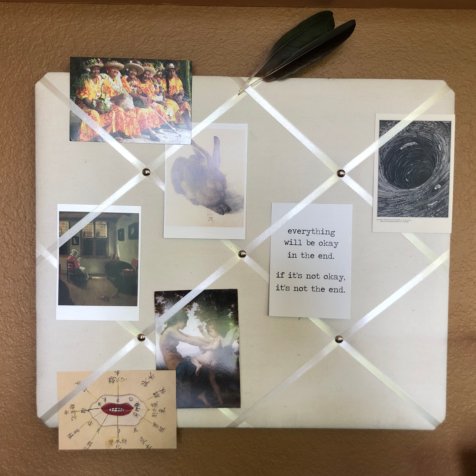 One of my renters when she moved out left behind a laminated green sheet with a list of primary emotions (fear, joy) and secondary feelings (loneliness, excitement) on it as well as a really helpful list on the reverse of judgments that we sometimes confuse with emotions/feelings: i.e., we don’t *feel* disrespected; that’s a combination of a real feeling (shame or anger) with an evaluation (i.e., this person doesn’t think I am as valuable/important as they are). Anyway, I wanted to come up with a way of visualizing the primary and secondary feelings because I’m a visual learner, and I remembered this stack of cool postcards I’ve accumulated from the Public Domain Review over the years in return for supporting them. From the stack, I selected images that strongly reminded me of the feelings on the green sheet. I already had a ribbon memo board up in the kitchen that I used for bills, receipts, etc. I took those down, and at least once a day, I tried to pause and select from the stack of postcards those that resonated with how I was feeling and make a tableau of cards on the emotion board.