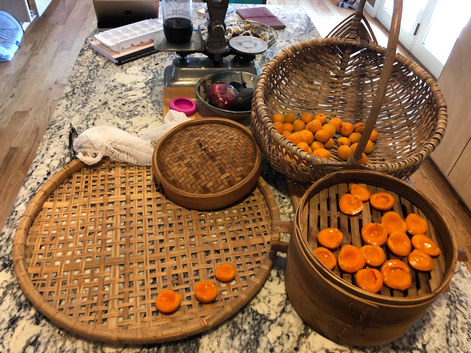 Recently, a bachelor neighbor of mine passed away, and his good friend and executor, Linda, put notes in all our boxes that we should come by for the estate sale. As it turns out, Mark was a big collector of baskets, so to the ones I had gathered, and Cynthia had left me, I now added a set of Mark’s bamboo drying trays, a nice wastebasket, and a beautiful little handled pine-needle basket that I think might be Paiute. I’ve been using the heck out of the drying trays as I got hammered with stone fruit this year and foraged a bunch of seaweed at the coast that needed to be put up before it spoiled.