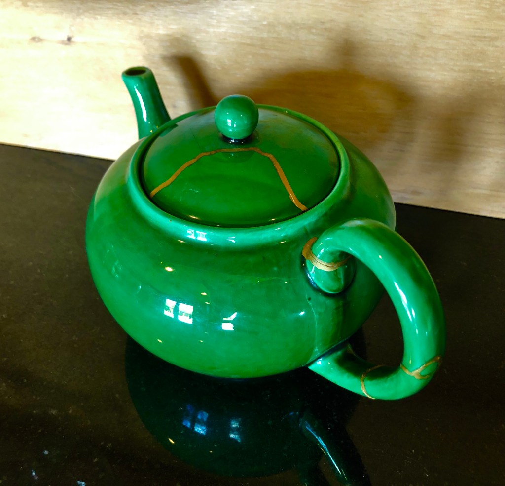 After she gave me that card, I went through my house and took all the ceramics I had broken and glued back together over the years and highlighting the cracks with a gold Sharpie. When I finished, I