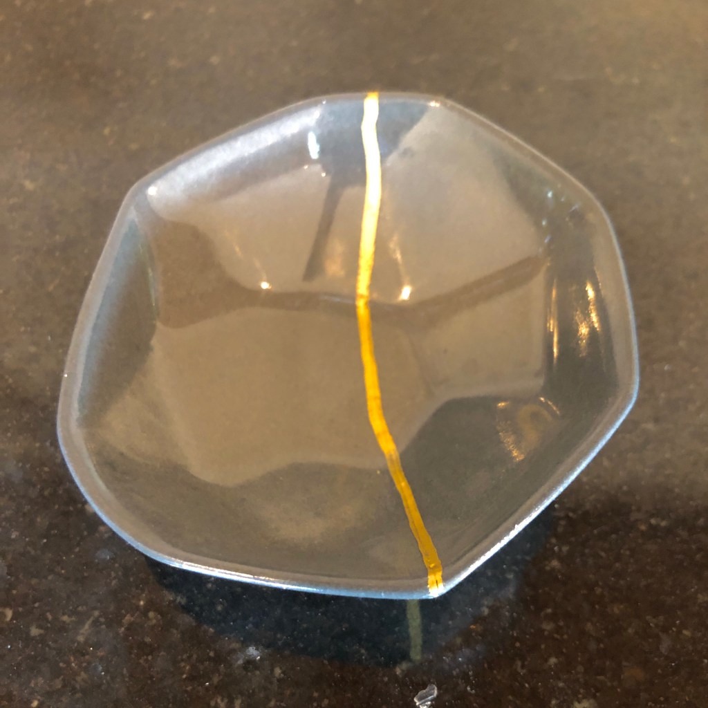 And then about a year after my divorce, my friend Jen gave me a greeting card that had a little bowl on it with golden cracks. The card’s inscription reminded me of something I had learned about in my Japanese art class in college—the art of kintsugi. In kintsugi, which means roughly “golden repair,” a broken bowl is put back together using a mixture of urushi lacquer and gold dust so that the fracture lines are not only visible but highlighted, shooting across the glazed surface like golden lightning, or lace. In this way, the inevitable breakage the bowl has experienced isn’t hidden but celebrated. Its scars tell its story in a way that makes it utterly unique and uniquely beautiful. The card Jen gave me said, “Remember this