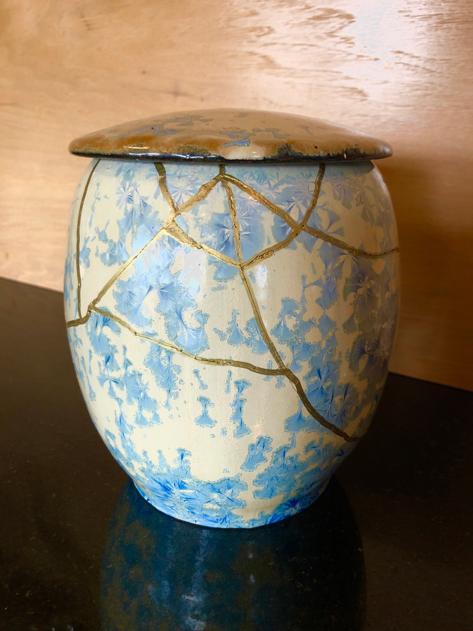 After she gave me that card, I went through my house and took all the ceramics I had broken and glued back together over the years and highlighting the cracks with a gold Sharpie. When I finished, I
