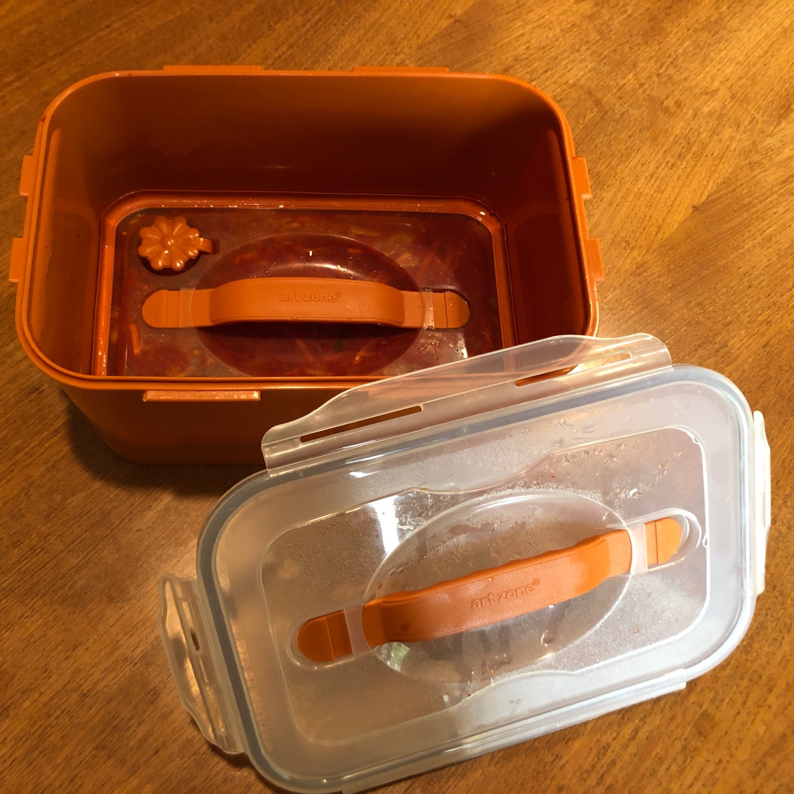 I love making kimchi: I use a combination of a recipe my Korean friend Hyunsuk gave me and this recipe. But it was always a bit of a struggle because I only had quart canning jars for fermentation and storage—which worked but were a hot mess (or, technically, a cold, bright-red mess). And then there is the sad story of the beautiful glass pickling jar whose bottom cracked out and splattered a fresh batch of kimchi all over my kitchen floor and cabinets because apparently it is a bad idea to run those jars through the sterilization cycle in your dishwasher…. Anyway, while I’m saving up for a legit onggi from Jeolla-do, I found this 4.9L Art Zone plastic fermentation and storage container at my local Korean grocer (you can buy them a couple places online, but I can’t recommend anywhere in particular—and there are lots of similar designs out there, some in stainless, which is nice).