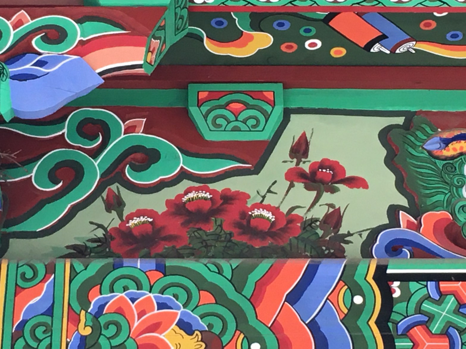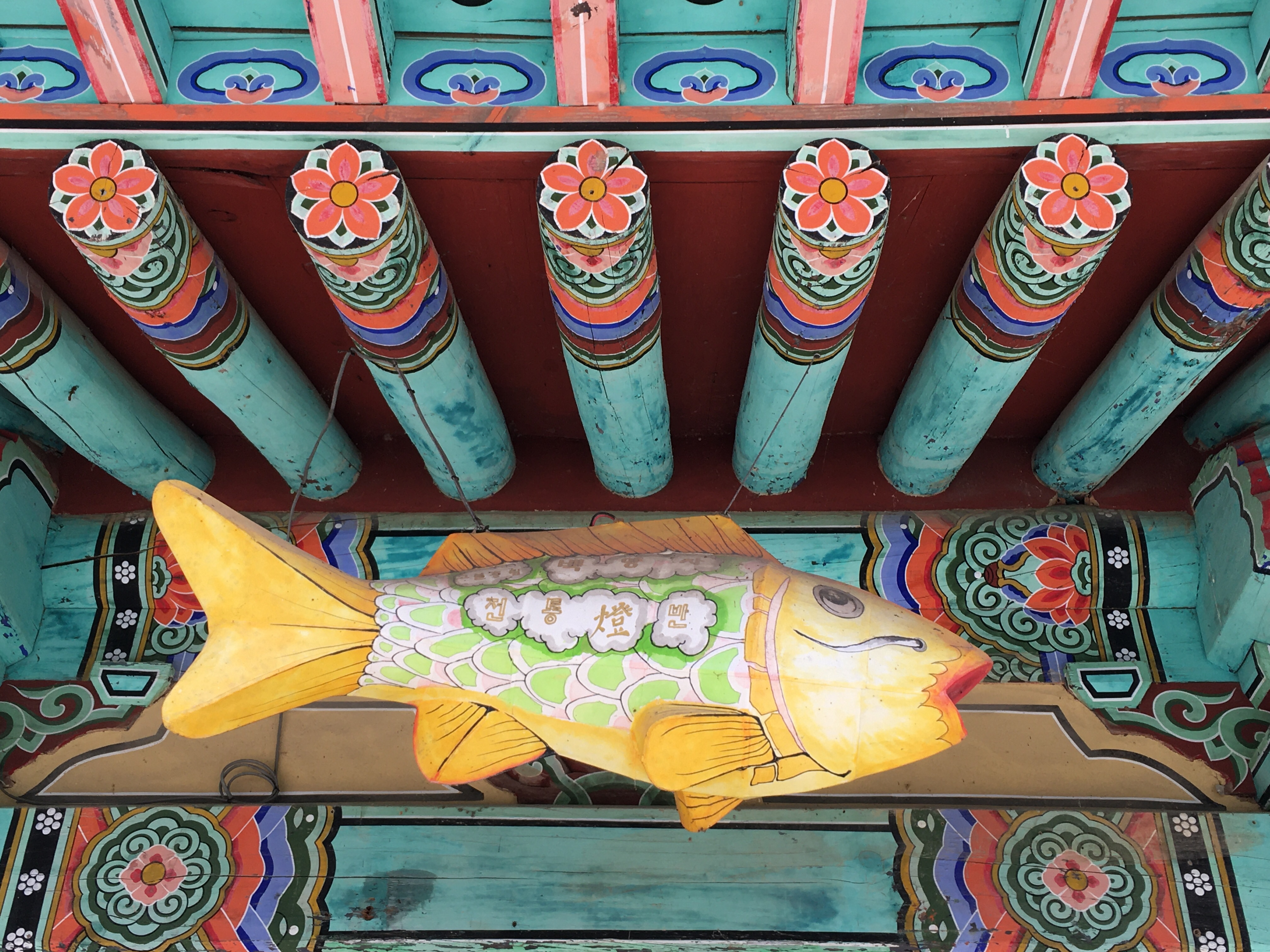 The Korean words of the chant are only distinguishable in throbs, like the vivid temple paintings of demons and patriarchs in the wavering candlelight. The rest is a harmonic drone that shivers the darkness filling Baekyangsa Temple at 5 am. It resonates in our tired bones as we stand and kneel and bow to the thrum of the Heart Sutra.