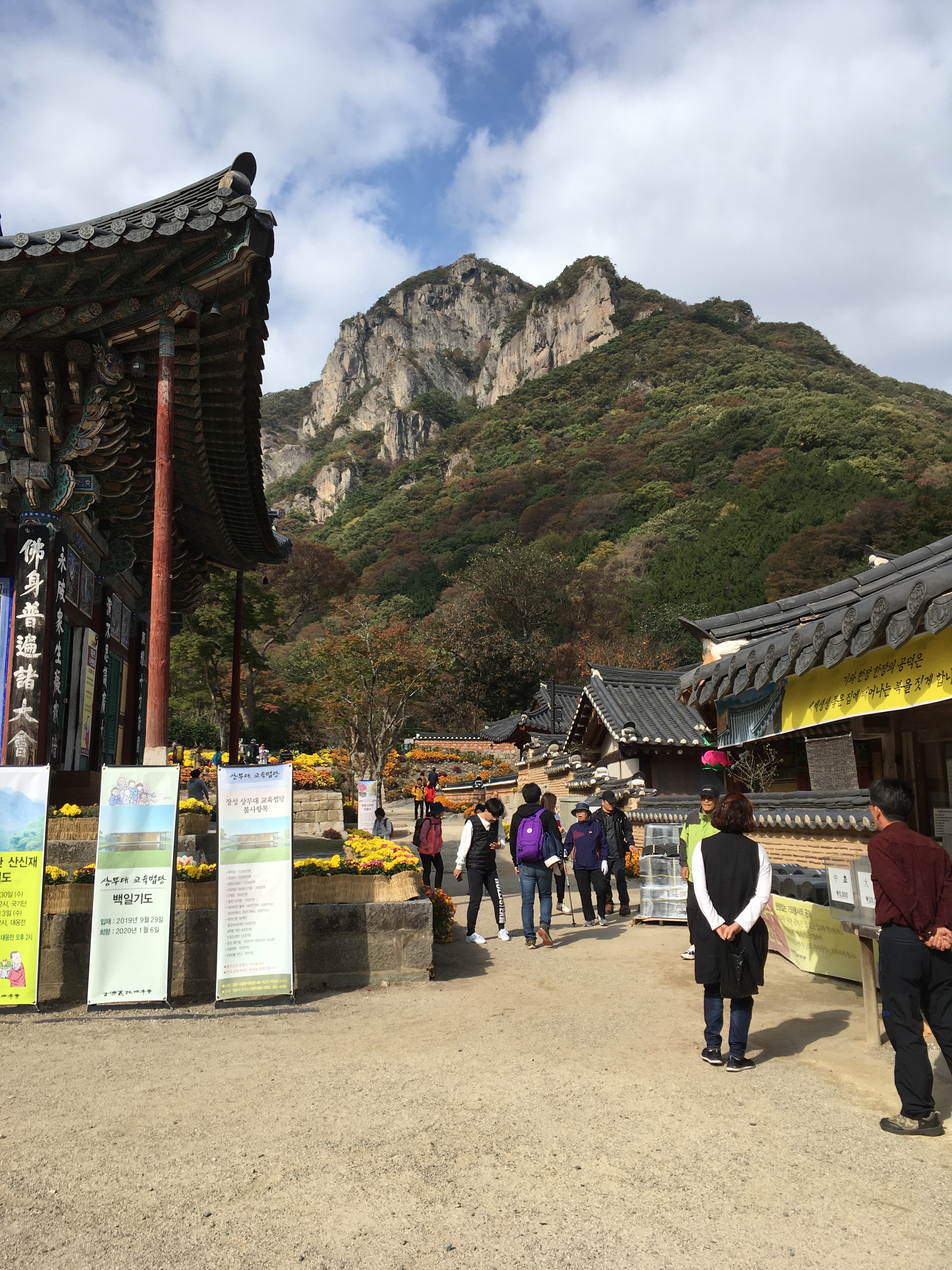 As we switched from train to taxi for the last leg up to the temple, we squinted into the sunlight dancing on Jangseong Lake, famous, our cabbie said, for eel hot pot and black-raspberry wine. Baekyangsa is a major destination for fall foliage tourism, and the little town at the start of the path up to the monastery was bustling even though the leaves were nowhere near their peak. Koreans are voracious weekend hikers. They go up to the mountains in great, joyous packs, kitted out in layers of color-coordinated Gore-tex, their phones thrust ahead of them on selfie-sticks to record every second of the hike. We swerved around busloads of older Korean women moving at a gentler pace but no less impeccably turned out in full make-up and Chanel sneakers. The restaurants lining the river were named things like Autumn Delight and First Leaf Viewing Delicious Korean Specialties: I could almost taste the proprietors’ desperation as the ladies drifted by without stopping. Finishing the fiscal year in the black depends entirely on this season, and our cabbie told us the foliage peak was coming later and ending sooner each year with climate change.