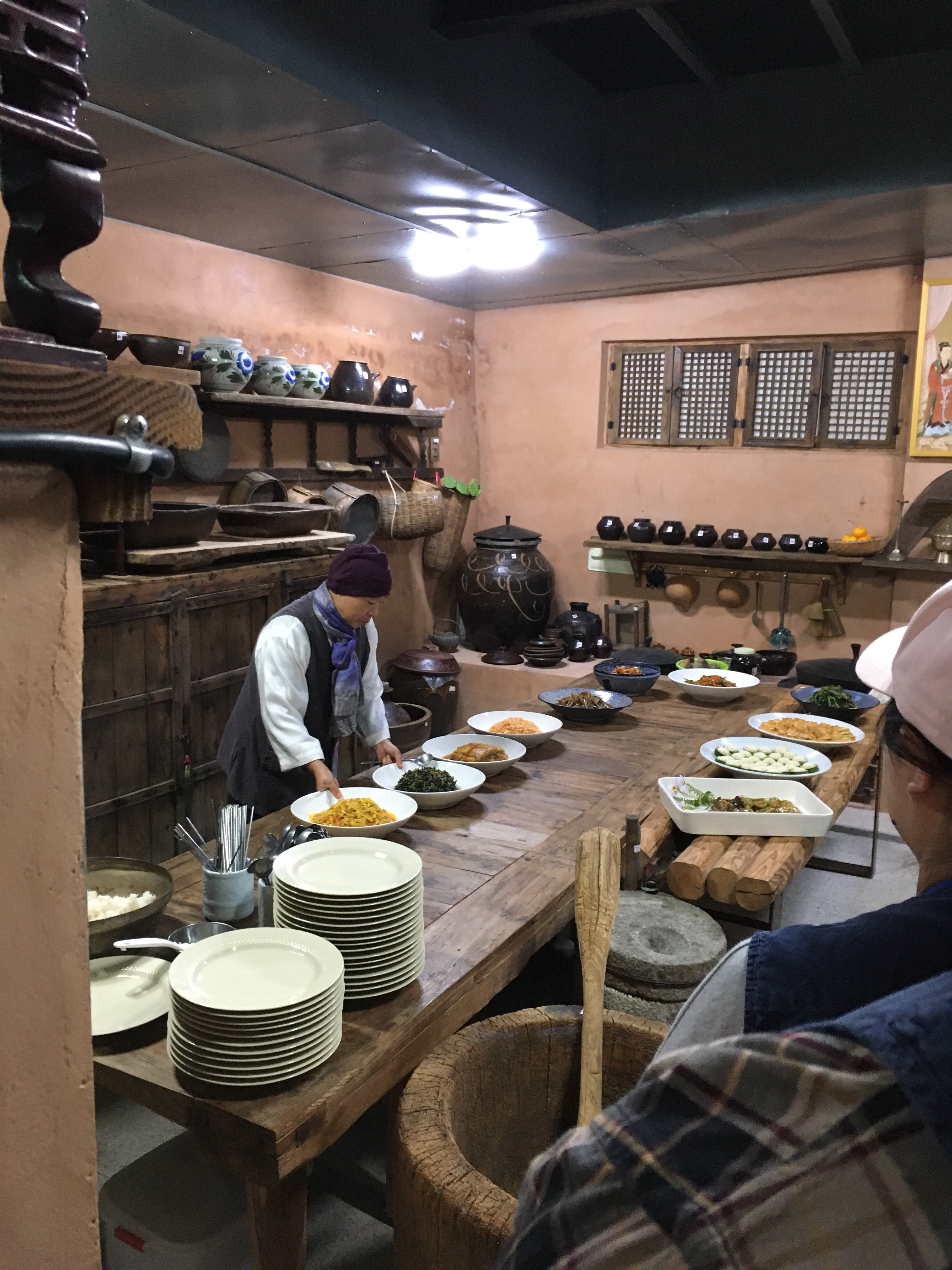 These dishes complete, Jeong Kwan invites us into her traditional kitchen next door, where the three platters she has assembled are laid out on a long wooden table with other dishes made by her assistants. The kitchen is my ideal of a kitchen: everything low, rough, and relentlessly practical, with an enormous iron wok set over an open charcoal fire pit, a huge fruitwood cabinet whose grain has mellowed over a hundred years or more, ranks of gorgeous, fat ceramic jars glazed glossy black, and pegs hung with gourds and grass brooms for scooping and cleaning. The walls are plastered a warm terracotta. We circle round the table and fill our plates then go back to our stools to eat.