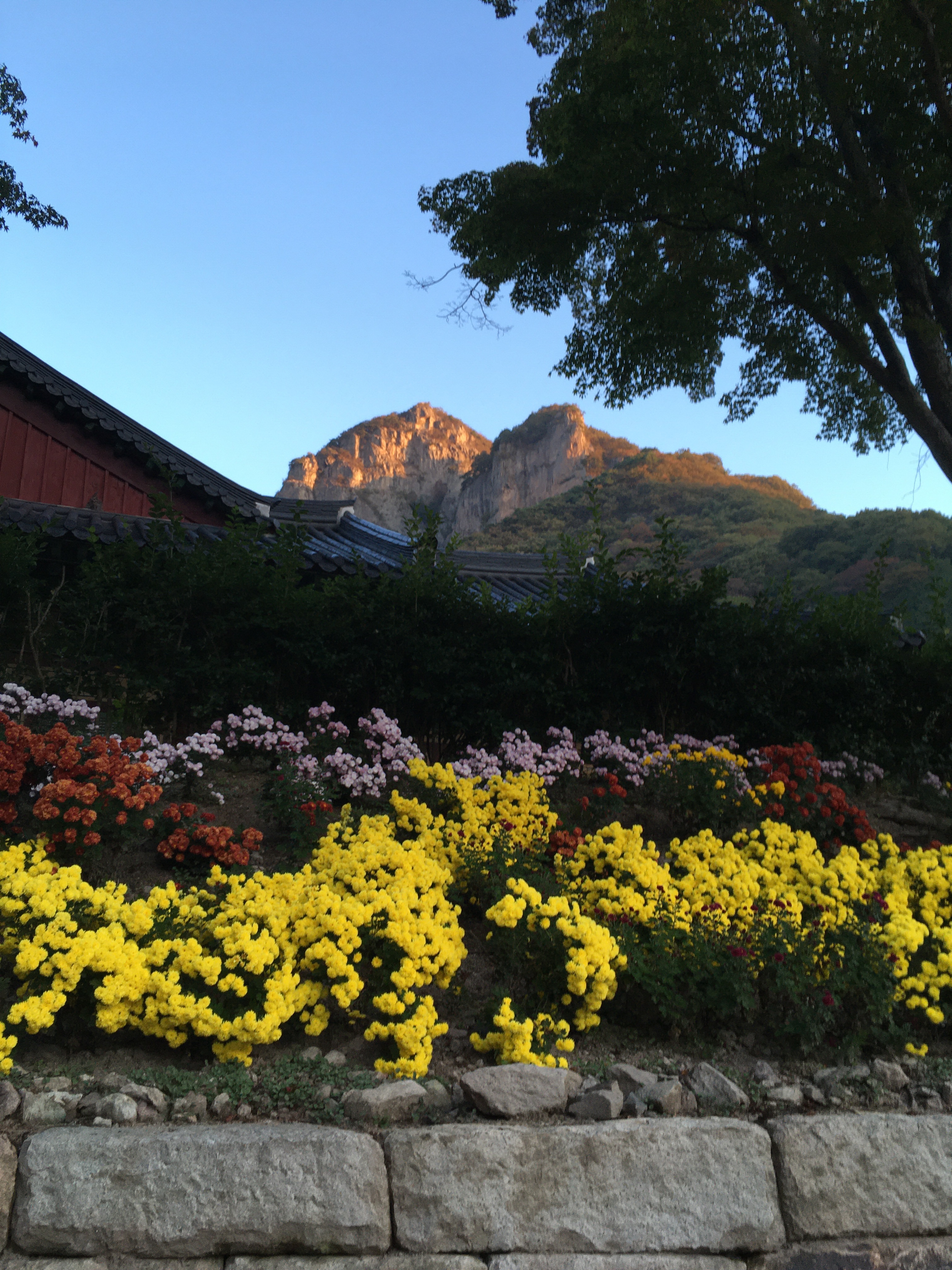 Baekyangsa claims to be one of the first Buddhist temples established in Korea, sometime in the 6th century A.D. None of the original structures remain. The oldest building in the enclosure dates from 1574; the rest were rebuilt in the 1910s after the Japanese destroyed them in retaliation for the support the monks had lent the Resistance. The reconstructed complex is lovingly maintained, tile roofs gleaming black beneath the benevolent stoney gaze of Baekamsan Peak, eaves daubed with brilliant flowers, dragons, and scenes from the life of the temple’s founder, the Venerable Yeohwan. Lush pots of chrysanthemums stud the rock gardens that frame every golden-gravel courtyard.