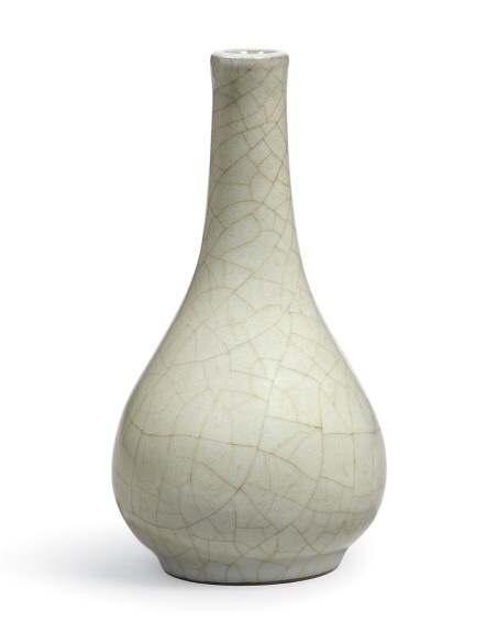 Song Dynasty ceramics marked “guan” were designated for use by the Imperial Court. But the term came to be associated with one of the Five Great Kilns in particular, near Zhejiang during the Southern Song (1127-1279). Guan ware is technically a form of celadon, but the precise glazing technique is not entirely understood. Multiple layers of glaze were applied, and the distinctive “ice crackling” crazing on the final layer was produced by a controlled cooling process. Guan ware, partly for its unique jade-like beauty and partly for its association with emperors, remains highly coveted; the vase above went at auction at Sotheby’s for roughly $1.6M.