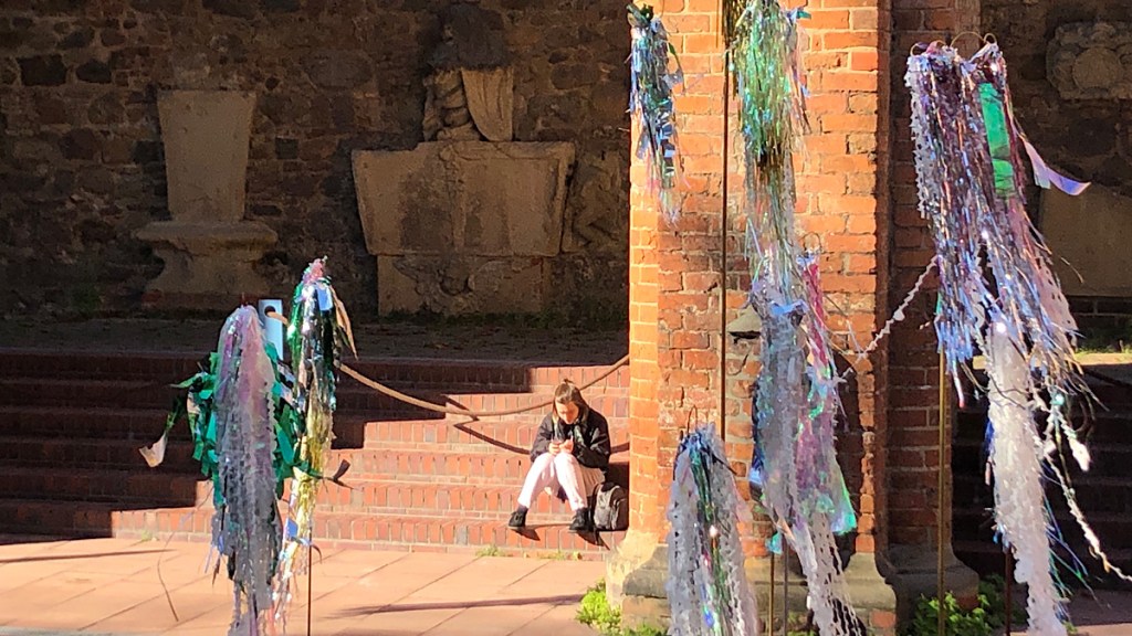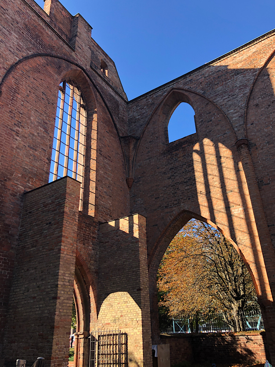 Right across from my hotel in Alexanderplatz sat the oldest building in Berlin: the remains of a Franciscan monastery from the 13th century that was the first outpost/settlement of the town by the Margrave of Brandenburg. There was a roughly simultaneous settlement on the nearby island in the Spree River that is now Museum Island, but that has been razed and built over so many times that nothing remains. This gothic church was built out of mud brick instead of the sandstone and limestone found in other gothic churches because that was what they had to work with in the exceedingly swampy environs of Brandenburg. The monastery buildings survived in various configurations until WWII, when everything was bombed to rubble but the northeast walls of the church. These were restored into a monument that now houses art installations of various kinds as well as the occasional concert.