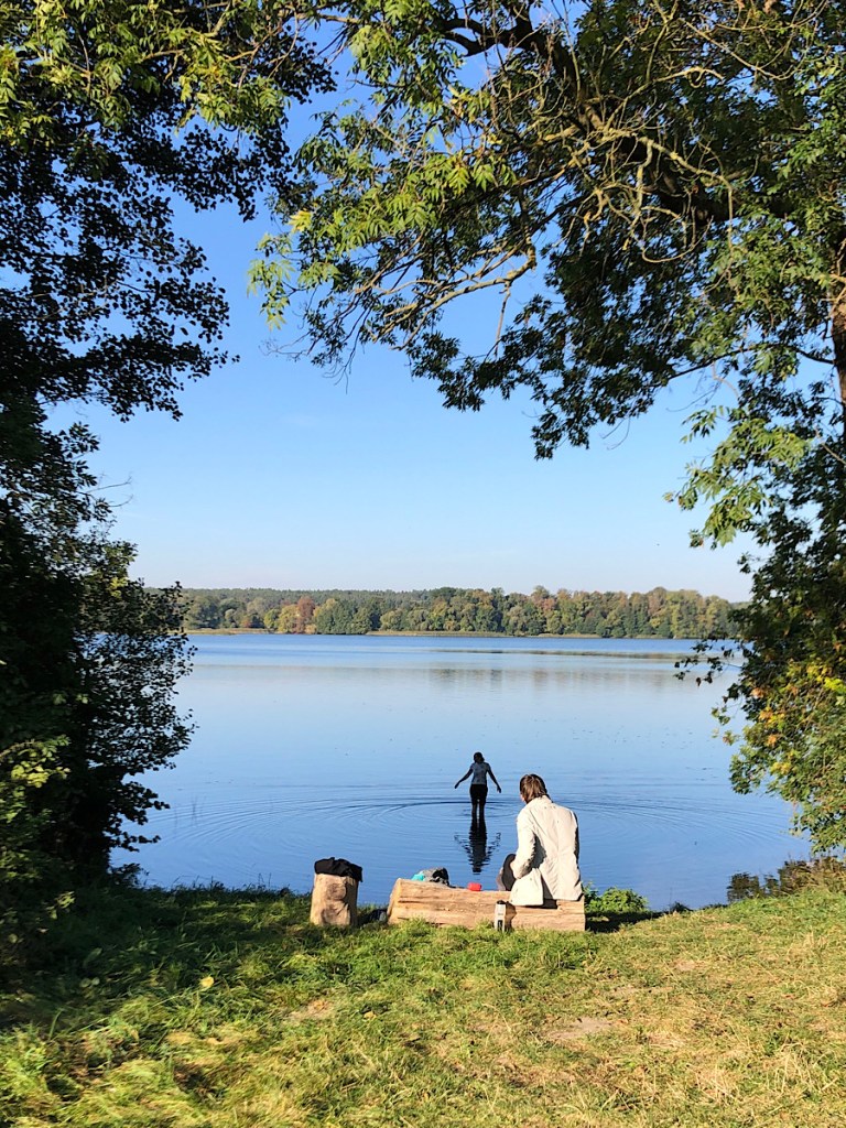 The ice-age part of the forest is strictly and understandably off-limits, but several nice paths circle through the newer (still several hundred years’ old) sectors, taking in a glaciated landscape of moraines, rolling hills, sandy fields, lakes, and ponds as well as the charming village of Altkünkendorf, and–of course, because this is Germany–at least one remote little gallery-café where you can pause for homemade cheesecake, coffee, and fresh-squeezed quince juice. (Germans really do not want to get hungry while hiking, and I’m 100% with them on this.) We took a couple folks along with us: Birgit’s colleague Myriel and her friend Andrés, a visiting environmental design scholar from Colombia. All of us sampled the Forest Listening tracks while on our hike, and it made for a wonderful afternoon; I highly recommend you do the same in a wood near you while the weather is still fine.