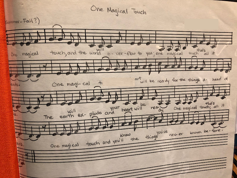 Similarly, there’s only one real choice in this category: “One Magical Touch.” I wrote it when I was 5 or 6, and my mom transcribed it onto staff paper for me. It’s kind of apocalyptic lounge music? I struggle to describe it. But I do get a whiff of Neil Diamond as well as the Bill Gaither Trio.