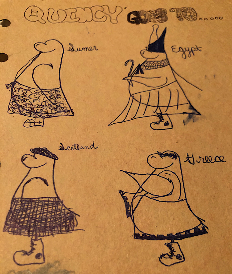 I’m also reasonably sure that I was the only person who liked the movie. It got horrible reviews, all laden with bird puns (e.g., “this one’s for the birds!”). It was based on a super-philosophical novella by Richard Bach about a young seagull who breaks the flight speed barrier and gets cast out of his flock, only to find a new tribe of like-minded rebels. Super cliché, but I didn’t know that word meant at the ripe old age of 7 or whatever. And I saw a lot of myself in Jonathan, naturally. Besides, King David’s best friend Jonathan was my favorite Bible character. I also fell for the movie’s gorgeous oceanic cinematography, the soundtrack, and the seagulls, which I was smitten with at least until I got bit by one trying to steal my French Fries in California when I was 14. I had a pewter seagull pendant (still have it). I even drew a seagull cartoon character for a while named Quincy. He wore Converse. My mom loved him. Let me see if I can find a picture of him. Huh: here’s a sampler on the back of an old spiral notebook from mid school. Not my best work, but I don’t know where the good ones are–maybe my mom has them? Anyway, you get the idea: