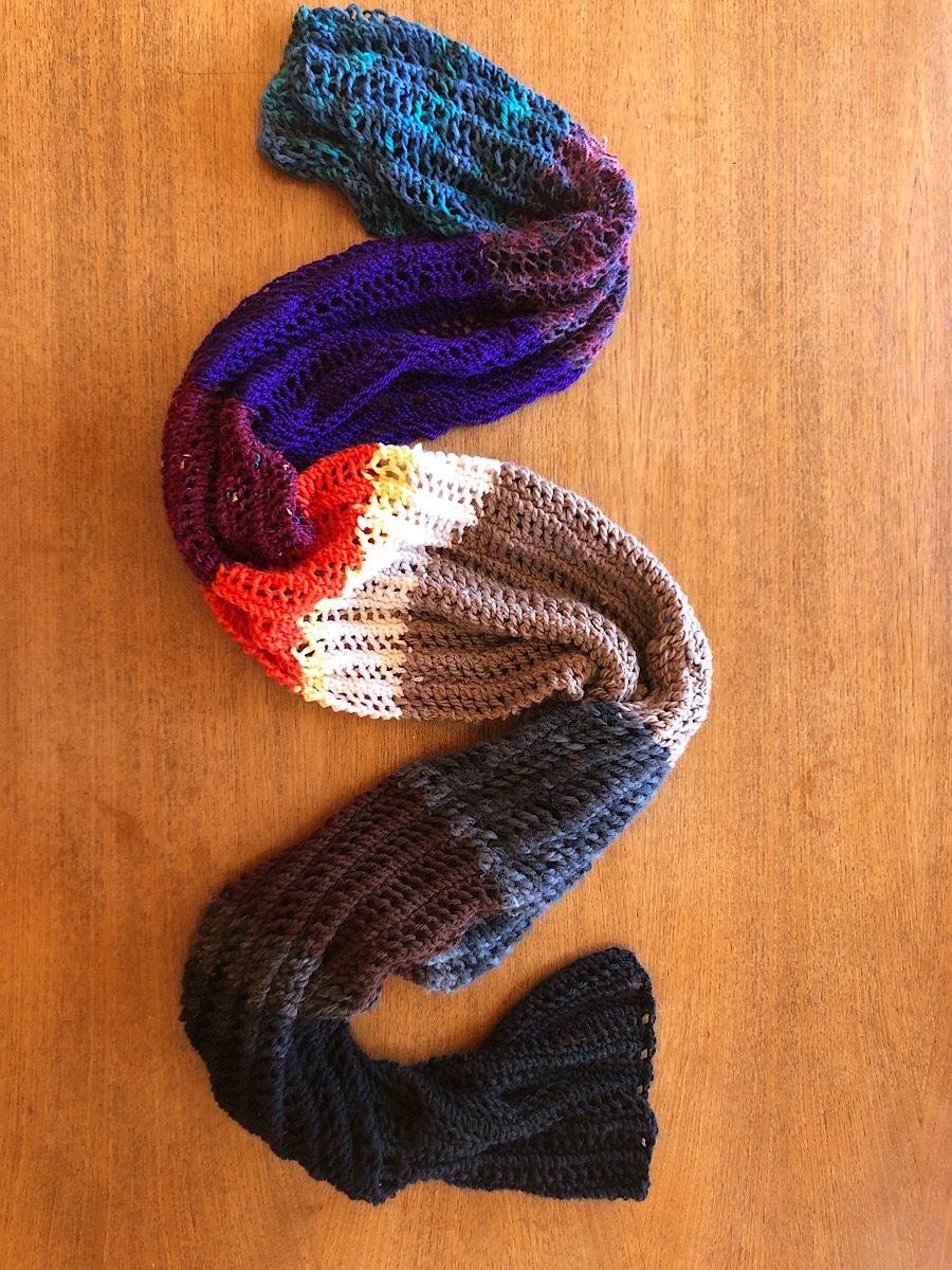 I can’t even remember which awards show it was last year, maybe the Oscars? But the New York Times (I think) ran a red-carpet slide show that sorted the looks by color and then put them in a gradient that started with black and went through gray to white, then did the metallics starting with silver and pivoted from gold into yellow, orange, red, pink, purple, blue, then the peacocks, then finished with green. It struck me as an innovative way of reorganizing the rainbow. So, when I was scratching my head as to how to upcycle all the odds and ends of yarn I had collected from various knitting projects over the years, that color scheme came to mind, and I did my version of it, using this really simple lace pattern.