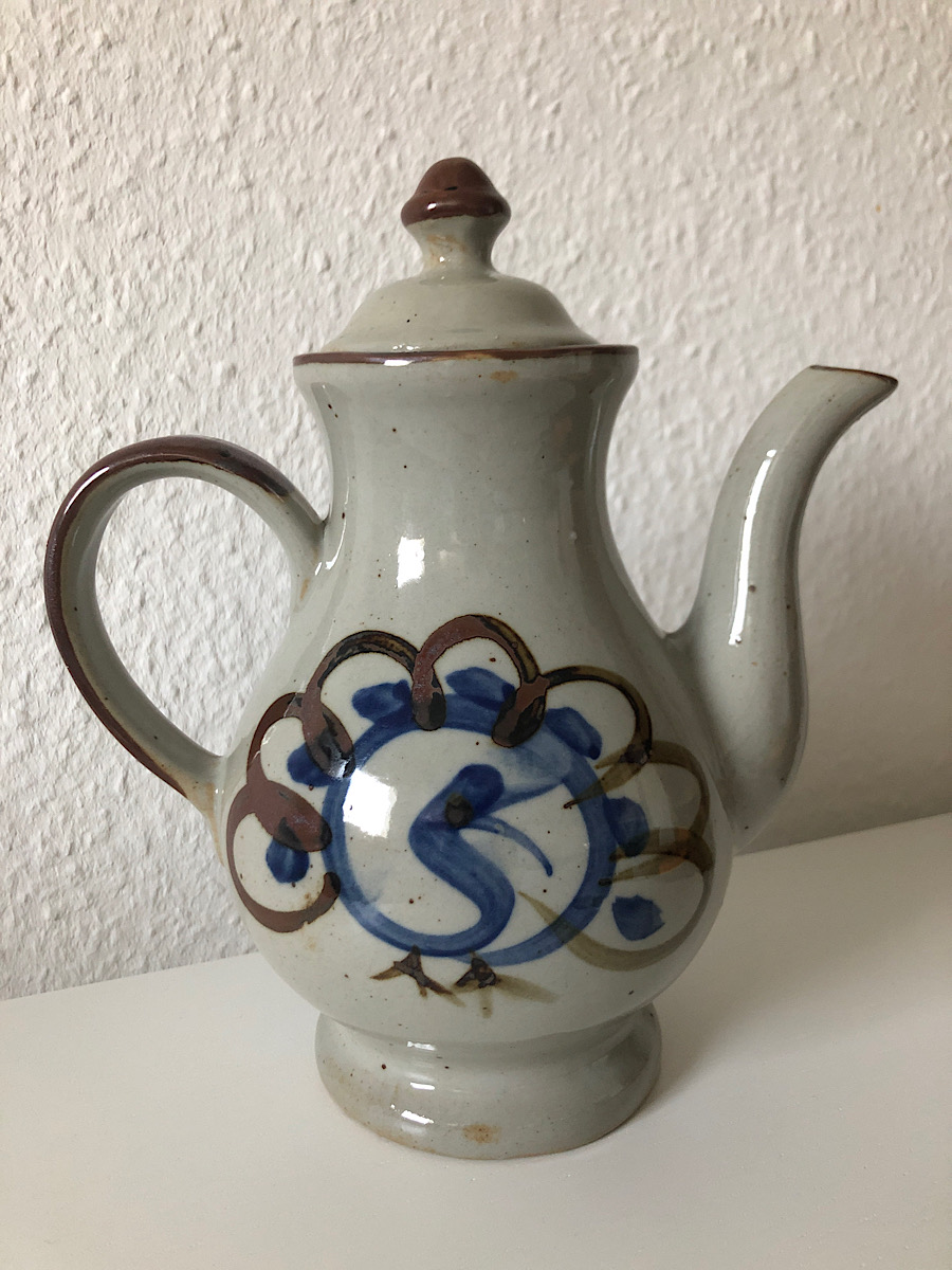 One of the neat things about Berlin is that you’ll just find random boxes of stuff on people’s stoops with a little sign that says “Verschenken!” (“give away”). On my way to drop off some knives for sharpening, I picked up this teapot (coffee pot, really) with a dashing little peacock on it. No idea where it came from; it has no potter’s mark. But it goes nicely with the random IKEA mugs in my rental and cheers me up when I look at it.