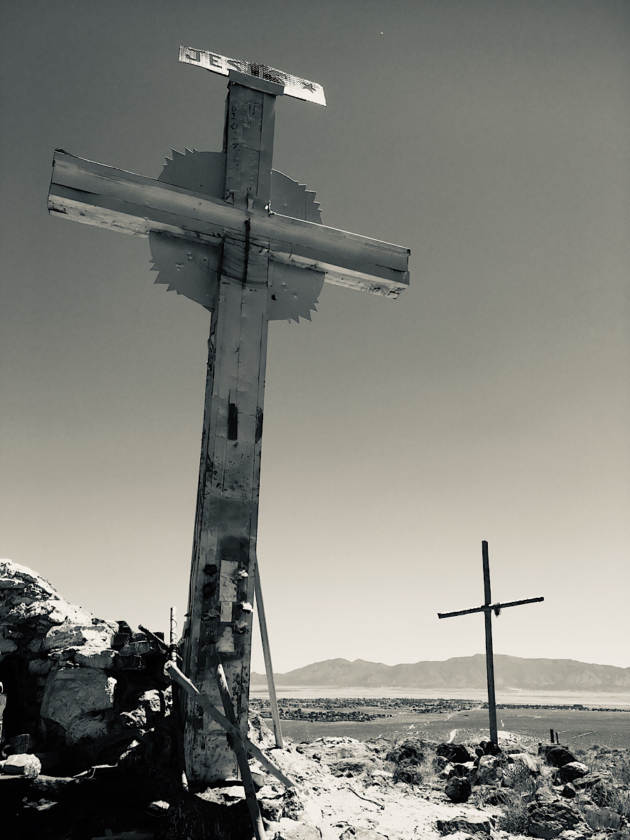 The trail is longer than it looks with a false summit. But finally I was standing at the foot of the crosses. They were more weather-beaten and shabbier than they looked in my dream. It helped, seeing them there empty. I looked at the little concrete shrine at the foot of them–at the candles in their glasses with the Virgin decals, the red-white-and-blue rosaries, a print-out of a woman who had died made into a watercolor by the summer monsoons. A marble block was chiseled with the lopsided words, “Perdon, Dios Mio.” Only a Superman t-shirt, too little, made me feel sad. I looked past the crosses to a ridge of rocks on the rim of the hill. Beyond that there was nothing but sage and rattlesnakes for ten miles till the mesa butted up into the jagged, blue wall of the Manzano mountains.