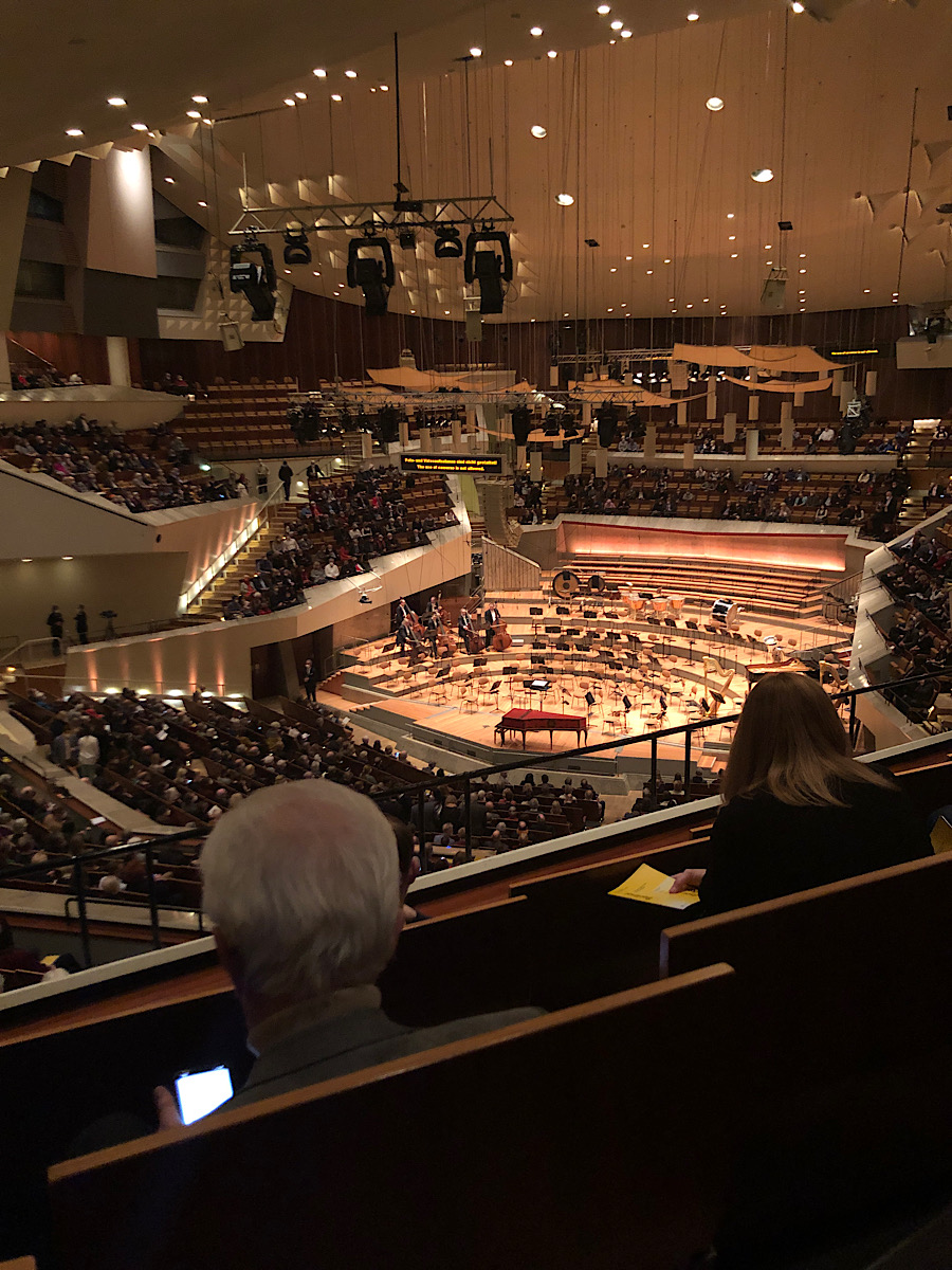 Last night I went with a group of friends to hear the Berlin Philharmonic play some ballet pieces by Stravinsky and a Bach concerto for oboe d’amore (Baroque oboe). First of all, the Philharmonic hall is a wonder in and of itself. Designed by Hans Scharoun and built in 1963, the hall was a bit shocking for its time, but many halls have copied it since due to its groundbreaking acoustics: there are no bad seats or sightlines in the house. The interior is…sliced up–there’s really no other word for it. It’s like someone made slits in a paper model and then stretched it out accordion style. But my friends were marveling that there was no awkward vantage point in the lobby or anywhere; the space flowed together even while cut into innumerable parts.