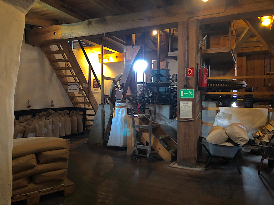 In the morning we elected for the slow route back to Berlin, which took us through Straupitz with its austere 18th century church and working Dutch-style windmill that still cranks out flaxseed oil (which Spreewalders think is very good for you and like to make lakes of in their quark), rye flour, and the occasional plank or two, when they get the 19th-century sawmill ginned up (2018 was the last time they did that). The blades on the windmill no longer turn; the whole thing has been electric since the 1920s. But, you can still tour the dizzying 5 levels of the mill tower and see the original ingenious design of the three wind-powered mills–plus watch a flaxseed-oil-pressing demonstration and taste a bit of the leftover seedcake if you like (sadly, I had to opt out due to a bizarre flaxseed intolerance I discovered a few years ago). Lunch was…what else? Boiled potatoes with quark, onions, pickles, and flaxseed oil (for those who can). I have to say I could eat a lot of potatoes and quark before I got tired of it.