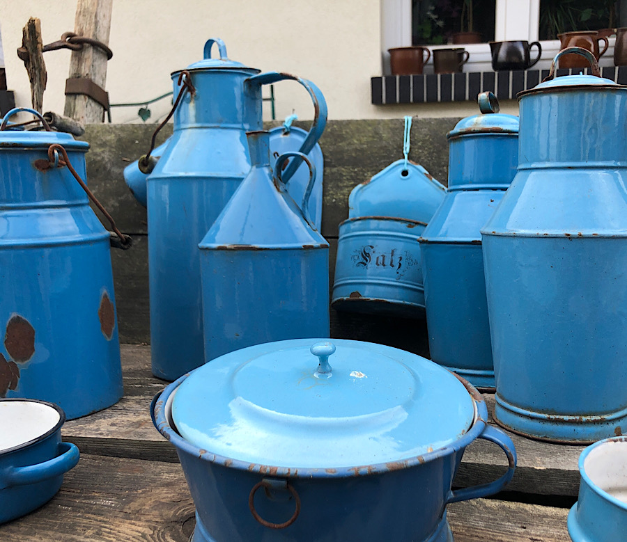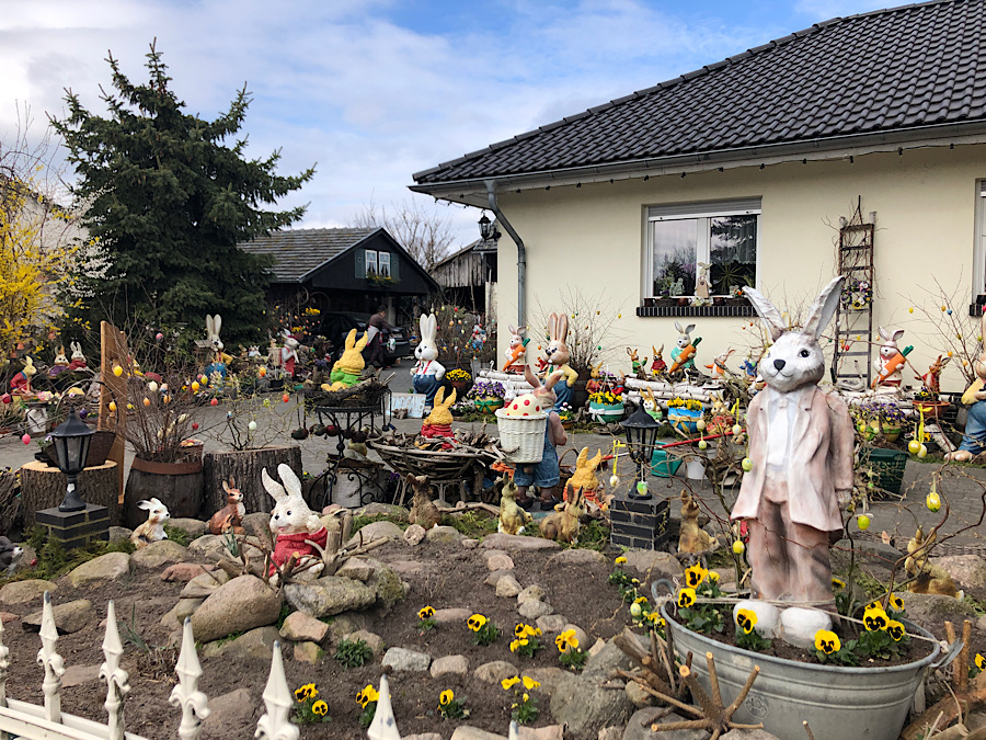 Our final sehr Spreewälder moment was a pause to see what the line of cars by the side of the road was about. Turned out, this woman decorates her yard with literally thousands of eggs and bunnies every Easter and invites passers-by to give themselves a tour of it. She also collects random other things as well, like blue-enameled cookware, brown jugs, and watering cans. It’s the clearest example of a collecting compulsion I’ve ever seen, with the operating principle being that N+1 of something is clearly better than N of it. I really liked the blue enamelware….