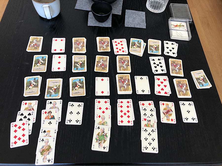 I learned a new form of solitaire from my colleague Birgit last week while we were in Spreewald. It’s fun and not too hard to win: you just have to make sure not to fill up all the open spots in a row if there are any cards already down that belong in that row but not as base cards (it’ll make sense once you look at the rules and play it through a few times). You can also minimize that problem by dealing in columns rather than rows, as shuffling 2 decks is an inexact science….