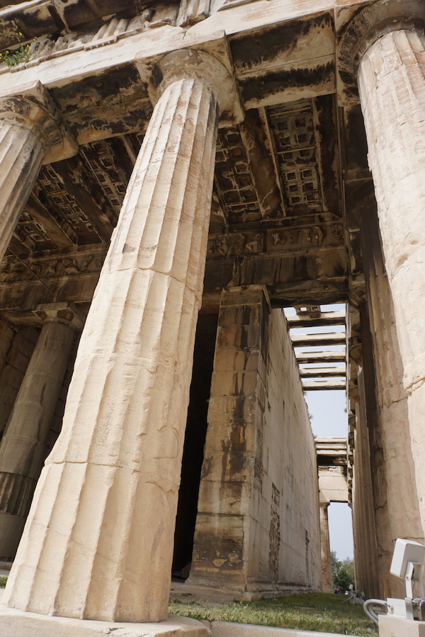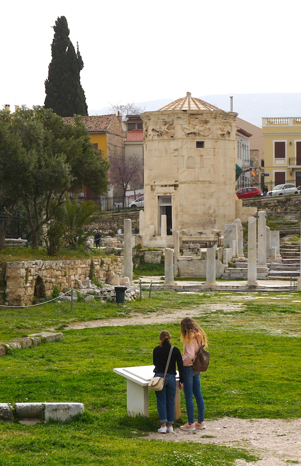 After a quick breakfast at our corner taverna, Taia, we hopped on the tram for a winding trip from Kassomouli to Syntagma through the National Botanical Garden. From there, we walked through Plaka–both really touristy and really beautiful, with jewel-box Byzantine chapels and crumbling villas tucked at the end of alleys–to the Roman Agora. We were there not to see the agora itself, which is just kind of a field, so much as the Tower of the Winds, an absolute marvel of Greek engineering built around 200 BC that stayed really well preserved thanks to being buried for much of the intervening time. It was an horologia, an astronomical water clock that kept track of both hours and days by means of hydrostatic pressure, a flow valve, a display cylinder or dial, and an ingenious ratcheting mechanism that advanced the system one day when the flow pressure reset every 24 hours. As a bonus, sundials on each of the 8 corners of the tower (it’s built like a compass rose) let passersby tell the time of day without going inside.