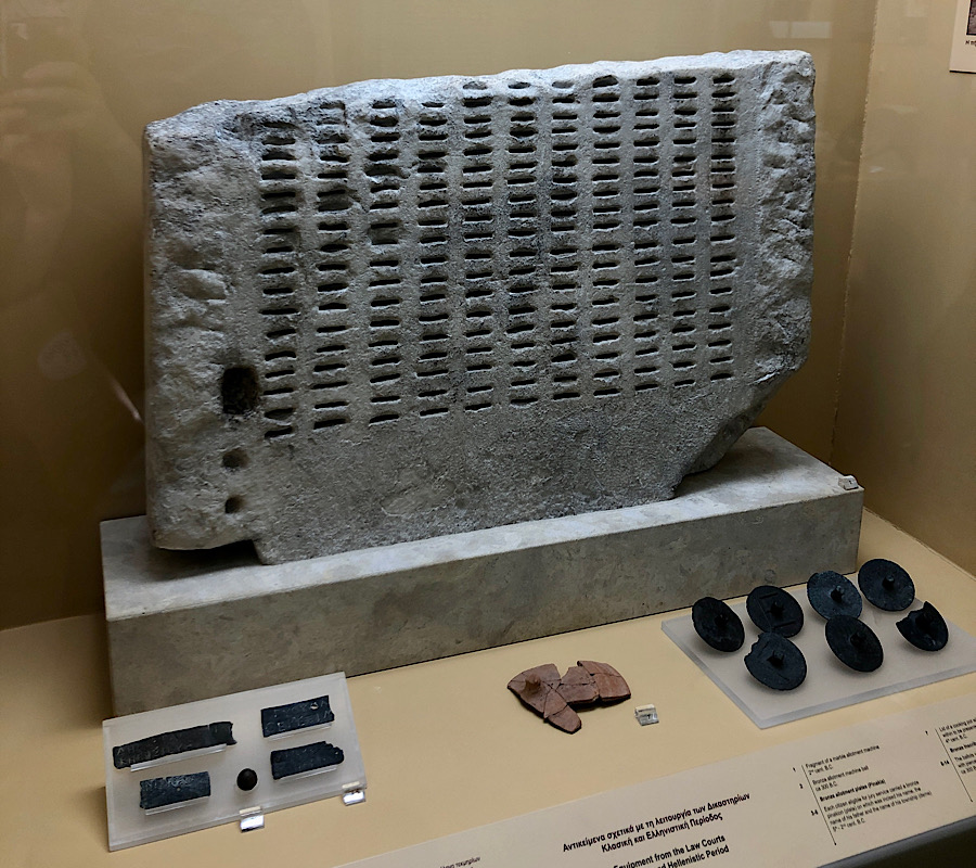 Every Athenian citizen (men from landholding families over the age of 18) belonged to the ekklesia and was expected to vote and be available for jury duty. The Agora Museum has examples of the special bronze voting tokens each man was assigned, as well as the remnants of an ingenious ancient jury-selection machine: citizens stuck bronze name-plates randomly into slots in a stone slab behind which ran a tube into which a number of bronze balls, painted black and white, equal to the number of filled rows was shaken up in a bag and loaded blind. Then, the balls were dispensed one by one, row by row; all rows with white balls were called for jury duty–Athenian juries could be as large as 500 citizens for important trials like Socrates’s. As Athens slid back toward tyranny, juries were called less often, and decisions that had been made by the ekklesia were increasingly made by the non-democratically elected boulé or related groups of oligarchs. I was impressed yet again with how much work it takes to maintain a democracy–even one as small as Athens’s had been (about 100,000 people at its peak)–and was reminded of Franklin’s famous quip when asked, on exiting Independence Hall, what kind of government had been ratified with the signing of the Constitution: “A republic, if you can keep it.”