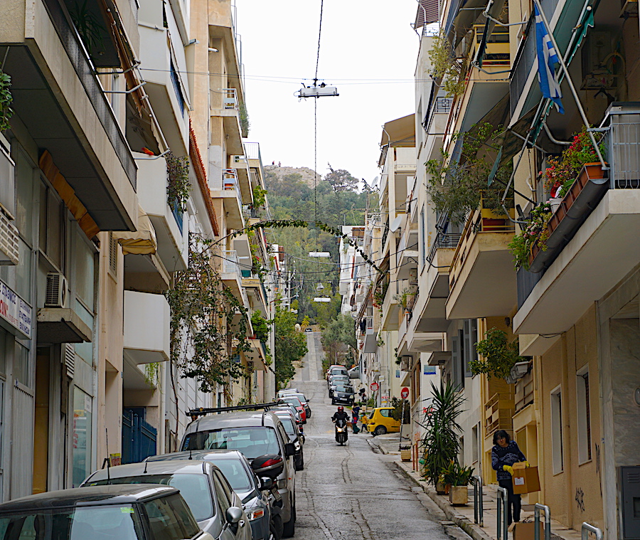 The conference didn’t start until Friday, though, so we had most of the day Thursday to explore. After we checked into our comfortable and well-located apartment in the Kyma apartment complex close to Onassis Stegi, we wandered through the dim, quiet neighborhood of Koukaki with its fragrant orange trees and balconies crowded with houseplants to a delicious lunch at Opos Palia: fried anchovies, beet salad with olive oil, the best moussaka I’ve ever had tucked in its own little casserole, and a tiny carafe of Malagousia wine to split. I actually took a photo of our meal, which I usually don’t do when I’m eating in public, and then I somehow deleted it. So clearly the universe does not want me to be a food photographer.