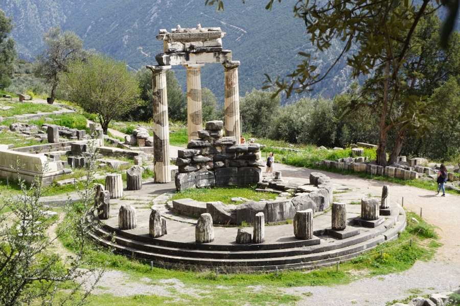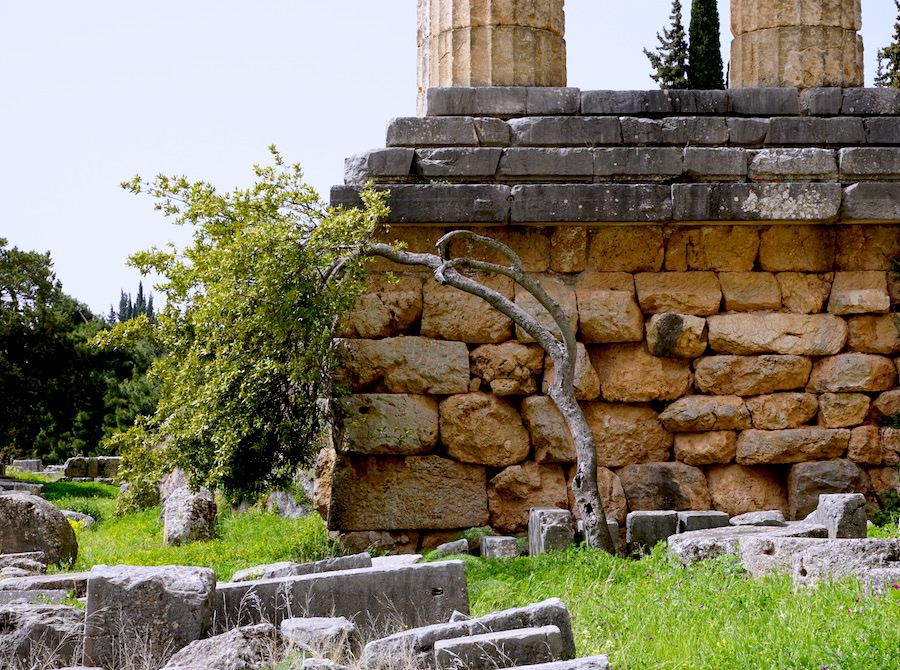 Sitting in that lofty spot and looking down at the ruins of Apollo’s temple, I wondered where the adyton was, the womb-like chamber in which the Pythia sat on her tripod, near the omphalos or navel stone, and gave her oracles; unlike at other Apolline temples, they haven’t conclusively located the space. I hoped that the Pythia sometimes had a chance to climb up out of that cave where everyone was high on power and fear and money and just sit in the sun like we were doing, listening to nothing more than the birds and the wind. Even if she and I don’t serve the same gods, I still have a lot of respect for her–for the generations upon generations of Pythias who dedicated the best part of their lives to helping their neighbors figure out how best to live in their chaotic world. In the end, the most helpful thing those petitioners probably learned at Delphi wasn’t anything the Pythia said to them, but rather the inscription they passed on their way to see her, chiseled into the lintel of the temple’s front door: gnōthi seauton. “Know thyself.”