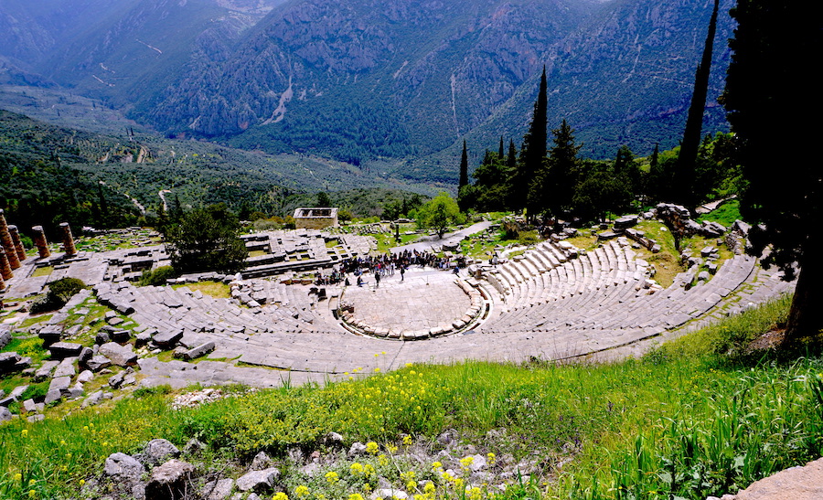 It really does help to think of Delphi as the Ancient Vatican–or, perhaps more accurately, Disneyland. Albert Tournaire’s 19th-century reconstruction above, though a bit fanciful, nonetheless does a good job of capturing its theme-park vibe. Shops lined the streets all the way to the temple, alongside shrines to associated gods like Dionysius and the Sibyl, gilded treasuries showing off the wealth of the member-states of the Amphictyonic League that supported Delphi’s upkeep, and scores upon scores of ornate votive statues and tripods donated by grateful petitioners. Every four years the Pythian games were held in the stadium and amphitheater perched above the Temple; in between there were various musical competitions and theater performances. In short, it was a circus. Today, the throngs of visiting tourists and highschoolers on their senior spring grips help keep the vibe going, though high up in the stadium, especially so early in the spring, it’s quiet enough to hear the bees buzzing in the yellow laurel flowers and the breezes–chilly from their run down Mt. Parnassus’s snowy flanks–soughing in the cypresses.