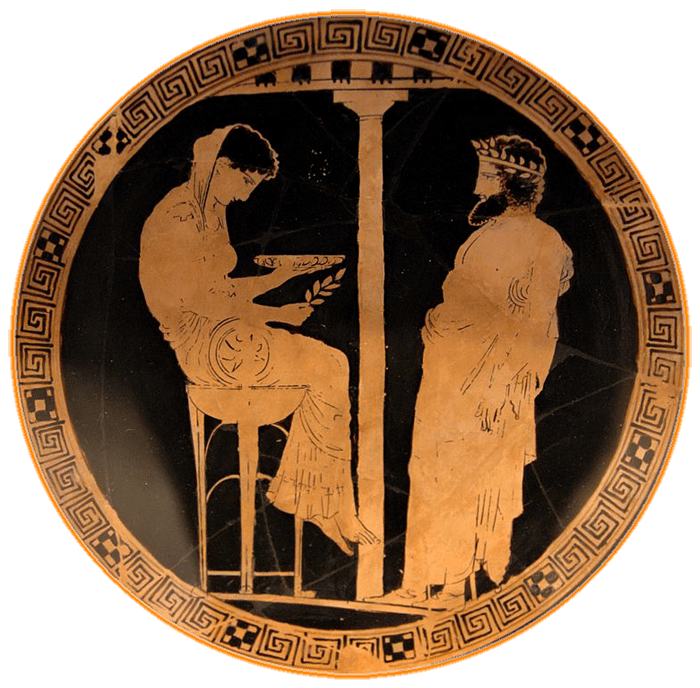 The vast majority of these pronouncements, however, were a fancy version of flipping a coin: the petitioner would ask a yes/no question, and the Pythia would draw either a black or a white stone/bean from a bowl to indicate Apollo’s response. Rarely did she speak: when she did, contrary to popular myths that she ranted and raved, eyewitness accounts indicate that she mostly spoke intelligibly in her own voice. Some of these responses were recorded in poetic hexameter; there, it’s unclear how much they were dressed up by the male prophetes who attended her as secretaries. Another category of responses were what are called amphiboles, meaning they had a double or open meaning and required discussion and interpretation before they could be applied to the situation at hand. One of the most famous of these was the “wooden wall” amphibole. Athens sent a theoros or messenger to Delphi in anticipation of (yet another) Persian invasion in late 481 or early 480 BC. The Pythia’s response was poetic and grim: Athens would be defeated, and the roof of the Parthenon would “run black with blood.” Understandably, the theoros requested a second word from Apollo; this time the god indicated that the city might be saved by a wooden wall. When this amphibole was debated back in the Assembly at Athens, many despaired at the prospect of erecting an enormous fence around the city with not nearly enough trees or time. But then the famous general Themistocles got up and said Apollo had meant for Athens to go out to meet the Persians on the sea in a naval battle–the sides of their ships would form the wooden wall that would repel the invaders. He ended up being right: Athens defeated the Persian navy soundly in the Battle of Salamis.