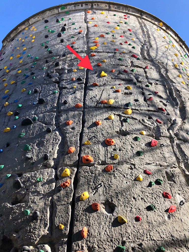 First, there’s the cone itself: It was as far as I know an above-ground bunker in which bombs were tested in the 1930s called a Winkelturm (named after the guy who invented the design, but Der Kegel was actually designed by Paul Zombeck). They found that testing bombs above ground distributed the shock waves without as much damage to surrounding structures from groundwaves and allowed for more accurate measurement of blast forces. Given that its walls were built to withstand bomb blasts, there was no way to demolish the thing, really, so in the spirit of German ingenuity, they turned it into a climbing tower, complete with summit book! It has what look to be some pretty moderate routes on it (as well as hard ones), but I haven’t climbed it b/c I don’t know anyone here who lead climbs; I just boulder on other walls at the Der Kegel gym.