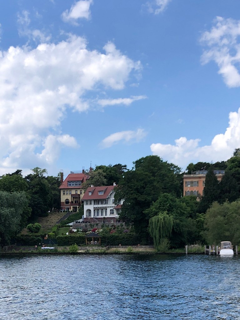 This segment (at least the way I did it), ends with a crossing of the Wannsee, a big lake south of Berlin that is unfortunately probably most famous for the Wannsee Conference. The mansion that hosted the Nazis looks just like all the other wedding-cake villa decorating the lakefront. The ferry crossing to Wannsee Station is covered by a normal BVG public-transportation ticket, has nice racks for bicycles, and motors by the Pfaueninsel–where a gaggle of peacocks originally marooned there by one Prussian king or another now have the run of the place–as well as past fleets of sailboats and beach clubs just now setting out their lounge chairs for the summer.