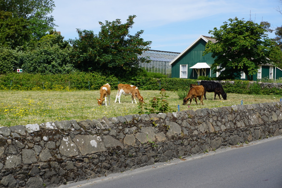 After stopping at the lovely old Vale Church, we rode on to a pleasant breakfast at The Kiln at Oatlands Village, a restored farming complex that in addition to the café now also houses several little boutiques and mini-golf. Rebecca’s chocolate sold us some cute and delicious chocolate “ormers” (abalones), and we admired the large-format chocolate cows (see below: she says she ships all over the world, so get your holiday orders in soon! We basically ate the bright-yellow Guernsey butter whenever we could, along with the cream and milk from the butter-fat-rich Guernsey cows–amazing stuff.)