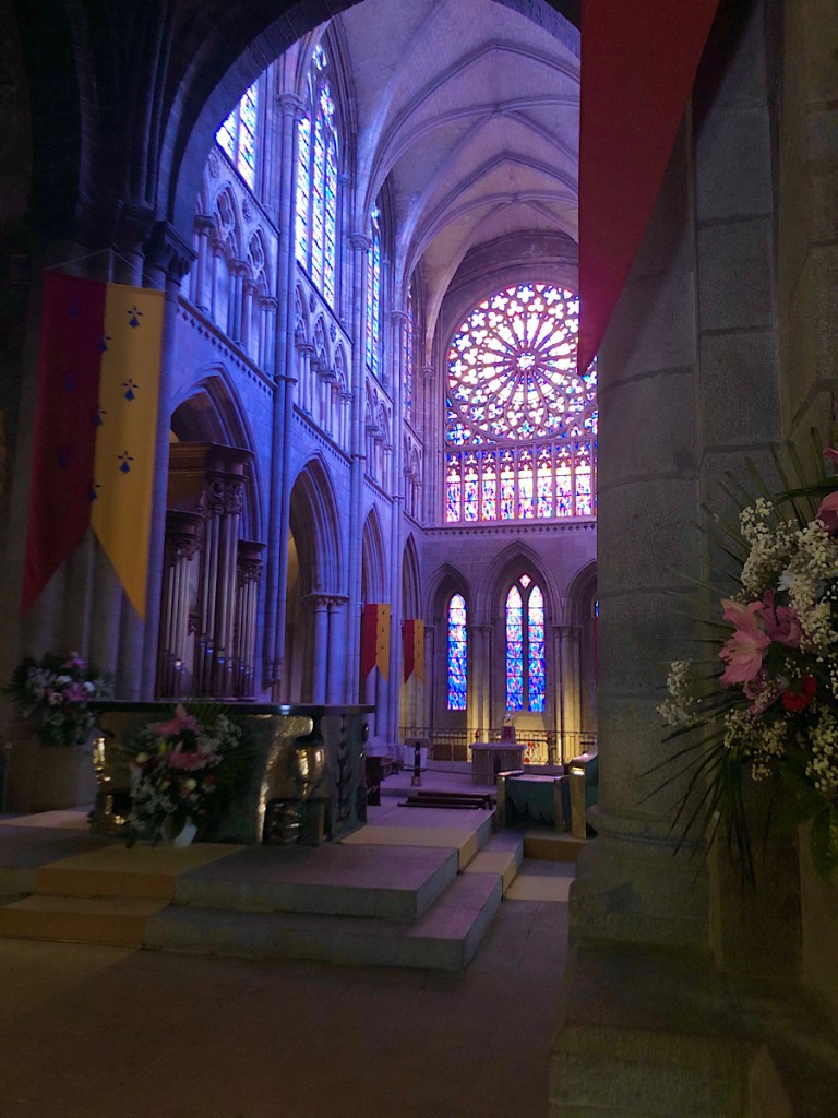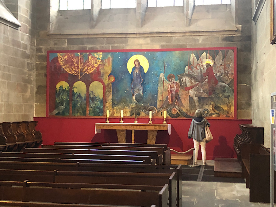 For the evening we strolled back down the digue (dike or bulwark boulevard) to the old city where we stopped first in the Cathedral Saint Vincent, which had been closed for a funeral the last time we had been in the Intra-Muros. Built starting in the 13th century and then bombed during WWII, it had just recently been restored with the addition of some fitting and tasteful modern artworks—including new windows and a bronze altar featuring Ezekiel’s four heavenly creatures. We shopped for some souvenirs before dining at Crêpes Lutins, a charming little boite with a wood-sprite-themed menu and delicious galettes. Then, we bid farewell to the old city for the final time and strolled back along the beach to our hotel in the long twilight.