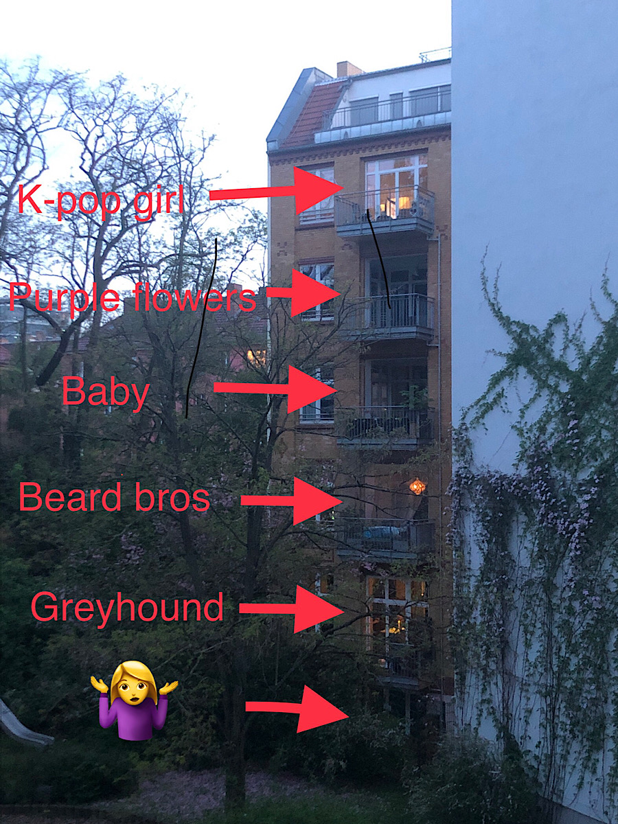 Breaking news, everybody. The stubbornly vacant-seeming 4th-floor apartment behind my building has cropped up with a pot of purple flowers on the patio, and the door that was previously cracked open from the top, Euro-style–to permit the circulation of that all-important (yea, even magical) German substance, Frische Luft–is now open open, as in someone could walk out it ANY SECOND. No one has, tho….