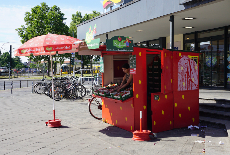 So, in May sometime, these adorable little strawberry-shaped kiosks popped up all over Berlin overnight. In the morning, the one down the block from me propped open its awning (even though mine is not strawberry-shaped, alas), and a friendly lady in a strawberry-printed apron started dealing out several really delicious regional varieties, in 500g packages or more, until her stock sold out for the day. A rotating cast of strawberry salespeople has been at it every day since (excluding Sundays). I’ve been known to go through 500g a day….