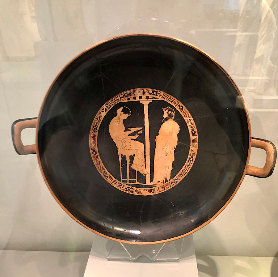The Museum’s stunning collection was assembled primarily from the imperial Prussian hoards of a series of Friedrichs and Wilhelms, with some additions from Schliemann’s predations excavations in the late 19th century. I visited specifically to view the Delphic kylix, the only extant contemporary depiction of the Pythia (above, with King Aegeus, who was consulting her about his childlessness; she instructed him not to “loose the foot of the bulging wineskin” until he was home in Athens, but of course he got Aethra pregnant with Theseus on the way home, drama ensued with his wife, etc….) But there were lots of other gorgeous pieces in the collection–mostly from the Classical period, but some nice geometric examples as well.