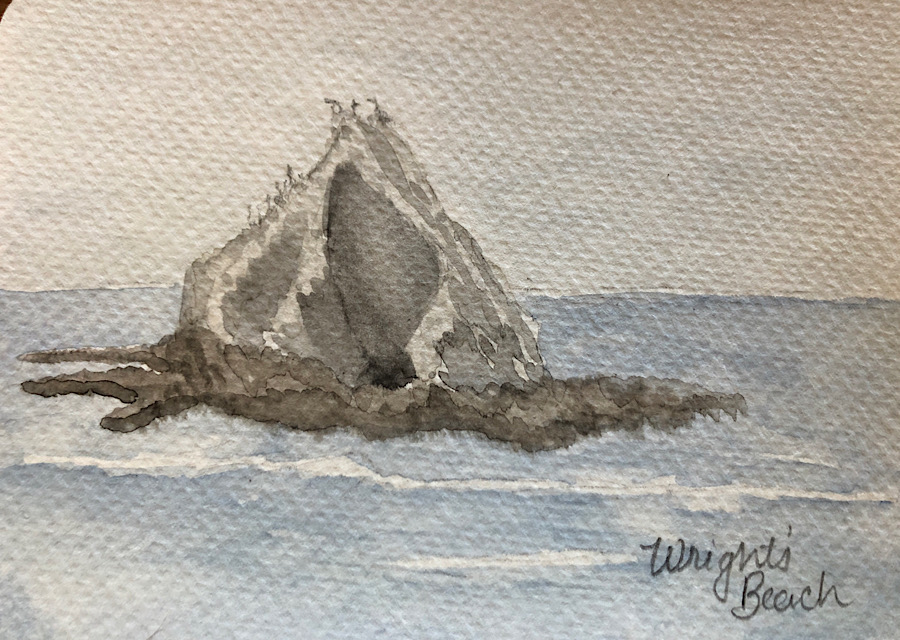 I’ve given up taking pictures at the coast: a two-dimensional image captures so little of the depth and sparkle and whoosh and roar and glow that it feels almost insulting. I like doing watercolors because it’s agreed from the get-go that you’re cropping out most of the experience and presenting an approximation of it–or, you’re presenting how it felt rather than how it looked.