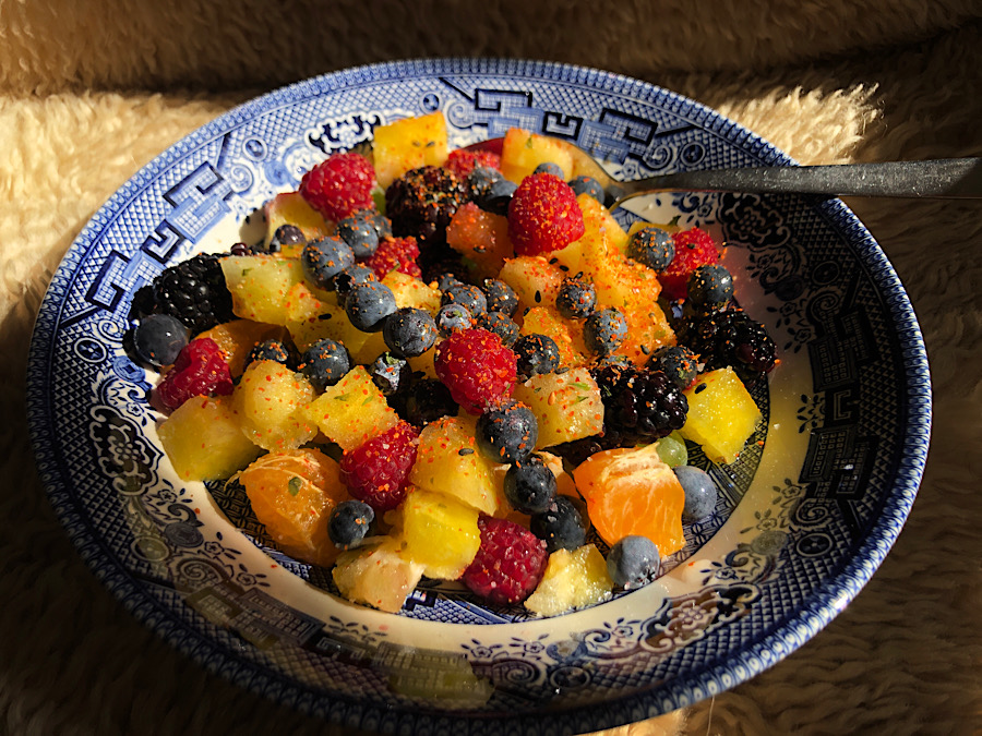 Here’s the thing I was doing wrong with fruit salad: You can’t just chop up fruit and throw it in a bowl; you have to compose and balance it, the same way you would any dish. When I learned to balance salty/sweet/sour, my cooking immediately jumped a couple of levels: when I threw bitterness/fat/heat into the mix, another level. Texture, another level….. Unsurprisingly, when I treated fruit salad at that higher level, I got predictably great results.