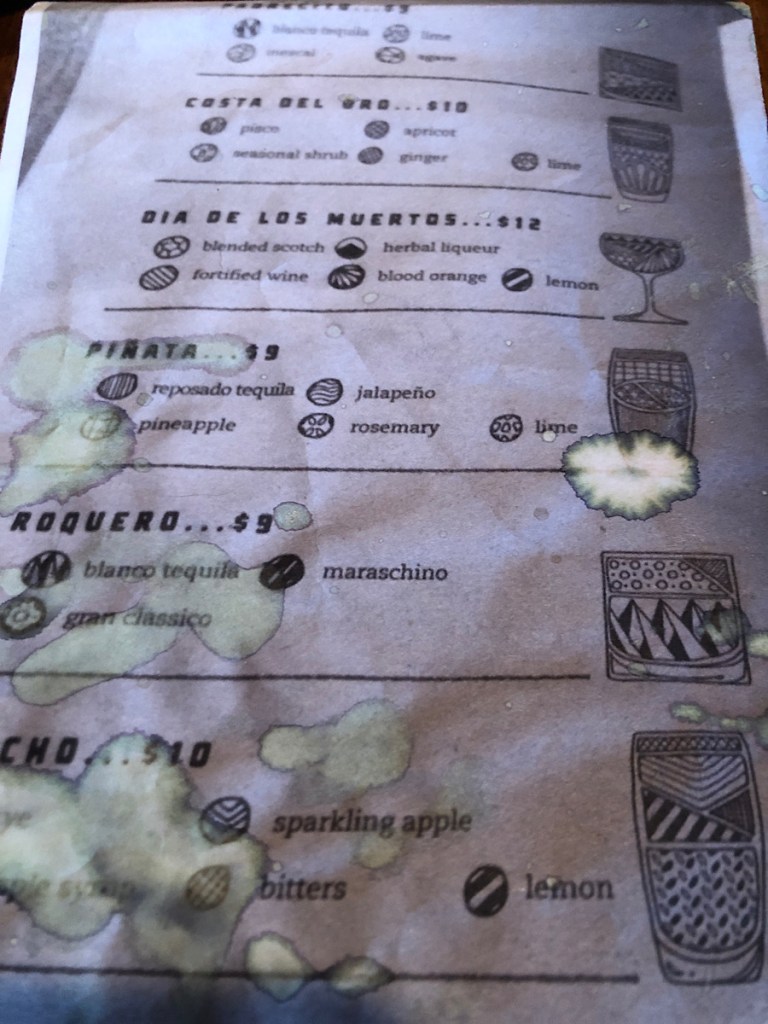 But I also have go-to cocktails–most of which come from three sources: the Southwest Airlines Spirit Magazine’s “Guide to Spirits 2011” (no joke, MANY great cocktails in here); Food & Wine’s Cocktails 2011 book (which I won in a drawing on Serious Eats!); and, a photograph of the menu from one of my favorite (and sadly defunct) Mexican restaurants, Padrecito (see below for a pic of the well-loved print-out of said photo), which had these gorgeous geology-style schematic drawings of their tequila and mezcal cocktails that were so accurate you could recreate them at home. Anyway, here are my return favs from those sources and others: