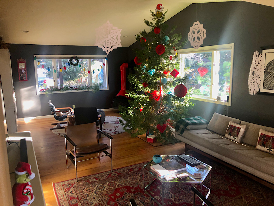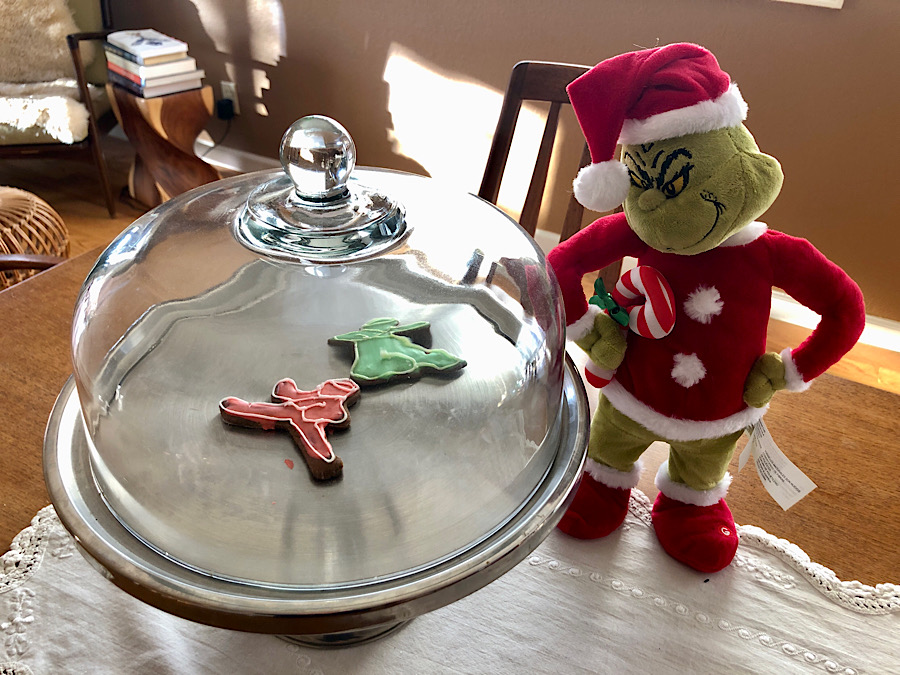 OK, it’s a little late, but that’s how I roll these days. Here are a couple of snaps from my Grinch-themed Christmas decorations. It all started with the animatronic singing Grinch doll my mom gave me this fall (ogling the ninjabread men there…), and then it mushroomed from there. Turns out there are websites willing to sell you all manner of Grinchy décor: here’s the one I used. The honeycomb C9 bulb garland is a new favorite….