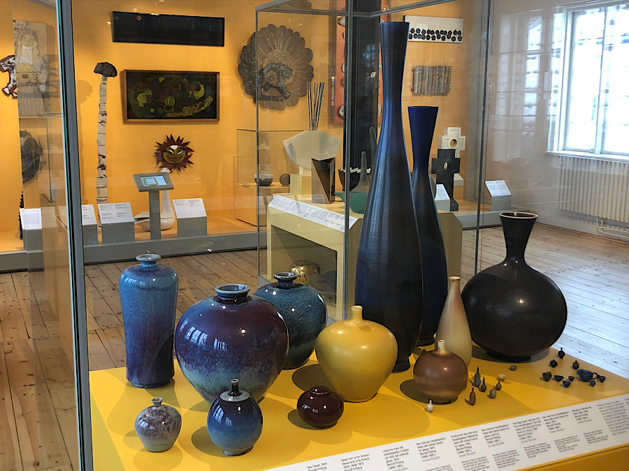 While I was in Stockholm, we took a bus out to Gustavsberg to visit the old porcelain factory and museum. Gustavsberg has been around since the early 1800s, when it mostly produced knock-offs of popular Chinese ceramics. But then it shifted into Scandinavian designs, and in the 20th century it fostered a stable of gifted mid-century ceramicists including Stig Lindberg, Lisa Larsen, and Wilhelm Kage. It also makes practical ceramics like toilets and sinks; I got a kick out of identifying their wares in the various houses and restaurants we visited in Stockholm…. We got to see an exhibit of contemporary ceramics at the museum (as well as the glaze test samples pictured above) and then do some shopping at their factory store and again around the corner at an outlet with Iittala, Rörstrand, and other Nordic tableware.