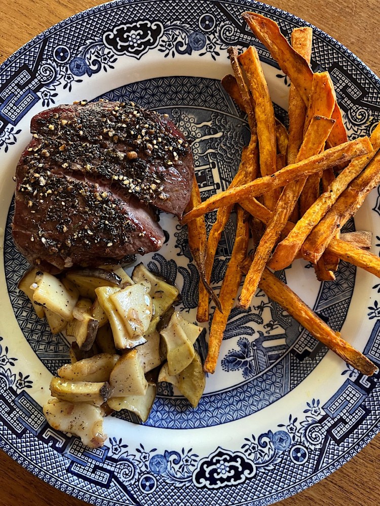 I got to meet some really neat people whom I think I’ll stay in touch with. I found out about another Mushroom Camp, SOMA camp, that sounds like it’s more my speed (not that I don’t love looking at pleurocystidia mounted in Congo Red at 100x under oil as much as the next girl…). And, if you’re wondering, yes, I did come home with at least one edible mushroom, in spite of it being really slim pickings due to the late snowpack. Turns out, there are only 3 species really worth eating in the spring in the Sierras, and none of them is a doppelganger for something that is going to kill you. Good news! I found a humongous Alpine White Waxy Cap (hygrophora subalpinus–not ground-colored!), from which I breaded and fried up medallions of the stipe (stem); it had the consistency of flavor of scallops. Oh, and here’s a porcini (fried up with brandy and served with filet au poivre and sweet-potato fries) I found the next weekend up at Gina’s cabin: she and her husband, Tim, know where all the good spots are.