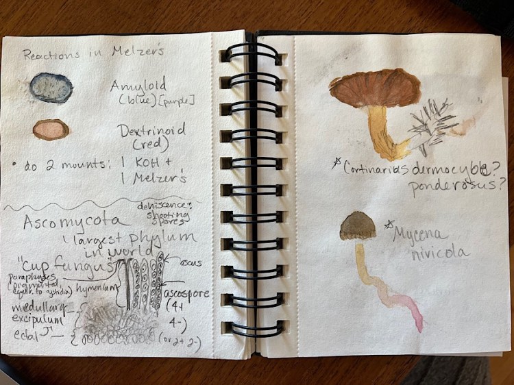 What did I get out of Mushroom Camp, in the end? A reintroduction to biology and microsopy, for one thing: it’s pretty cool, and I’m thinking about getting my own dissecting scope, at least…. I learned how to make spore prints, too (like the one in the header image), which are really pretty and important for ID-ing mushrooms. Here’s another page from my lab notebook: