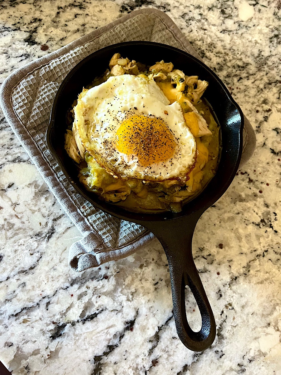 We stack our enchiladas in New Mexico, probably because it’s quick, and we put an egg on top because why wouldn’t you put an egg on top? Everything happens fast and in your tiny skillet: heat up a little more olive oil than you think you’re gonna need, fry an egg nice and crispy around the edges, pull that off and then waterproof 3 corn street-taco-size tortillas in the remaining oil; when the 3rd one is on its second side, slather on your fillings of choice (I did chicken, green chile sauce, and raw chopped onion) and a slice of cheese; repeat 2x. Run under a broiler to melt the cheese or just put a lid on the pan for a couple minutes after you turn the heat off. Top with your egg, and your tiny, adorable lunch is served.