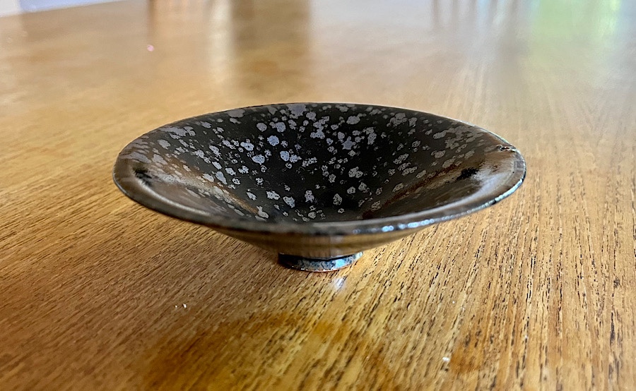 Anyhoo, today’s ceramic piece is a Northern Song/Jin-style tea bowl I own with a very cool glaze I don’t think I’ve talked about much, and that’s the oil-spot glaze. Basically it was an accident, resulting from too-early cooling in Jian kilns that caused the ferrous glazes to gel into shiny, halo-like spots instead of running into hare’s-fur streaks like they were supposed to. True Jian oil-spot pieces are rare for this reason, once in a blue moon so gorgeous that they end up national treasures. But in the later Northern Song and Jin, when/where they copied Jian wares for the Chinese and global markets, potters developed a more reliable technique to create the spots, which was under-glazing the black glaze with a glaze rich in hematite or magnetite before firing, which insulated the ferrous glaze and produced the spots. That’s the technique that was used on my bowl.