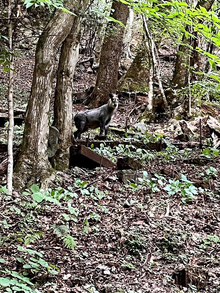 Due to the dry conditions at that point in the summer, the falls themselves weren’t anything to write home about, and the trail was very steep, so it was a good thing we were rested up. But the hike through the moody beeches with the rain pattering on the canopy above us was tranquil and relaxing. Plus, we had a rare (we were told) sighting of a kamoshika, a native Japanese antelope that was hunted to endangered status but has made a big comeback in recent years as conflicts with foresters have abated (apparently they really enjoy the taste of the saplings the foresters try to grow after clear-cutting a plantation). It was more than a sighting; he accompanied us on our hike for a solid 10 minutes or so, taking a few switchbacks and then waiting for us to catch up.