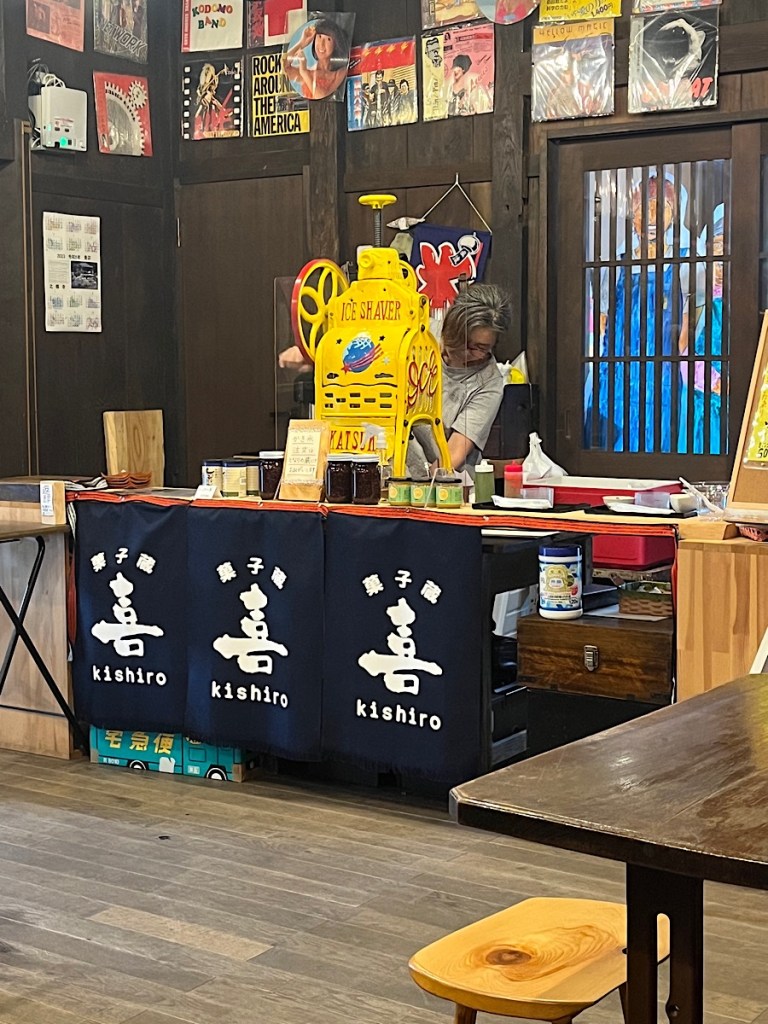 We had promised ourselves gelato and a soak at the public footbath after our hike and so made good on that deal with a couple of nice peach and hazelnut scoops from Taguchi Hyokaten and a pleasant few minutes swishing our feet in the hot water and looking out at the Kiso River. The weather was holding up nicely–cloudy and cool but not rainy–so we hiked uphill to the preserved Fukushima-juku or old town where the Nakasendo originally passed through and looked in the windows of traditional sweets shops, kaiseki restaurants, and inns before heading back downhill to Kishiro Café for some Kakigori (Japanese shaved ice with tea syrup and sweet red beans) and a rest in a low-key hall full of Suzuki guitars–which were made there in Kiso-Fukushima (the valley is famous for the quality of its timber and wood-working–and album covers from 80s Japanese rock bands.