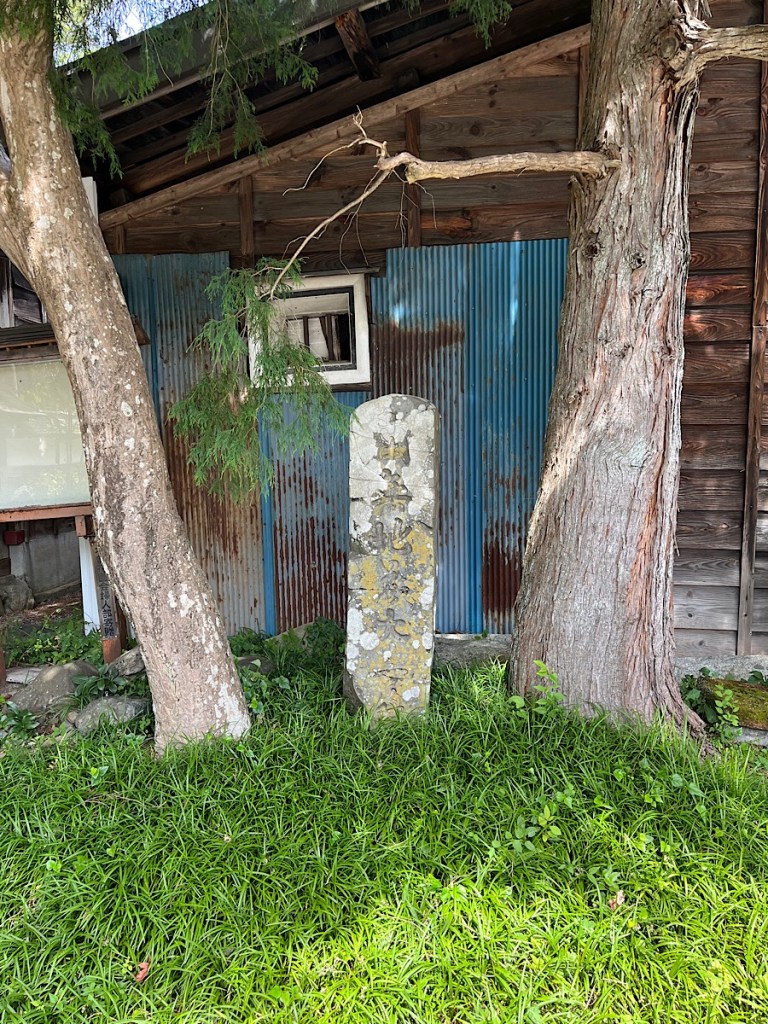 The track led us steadily uphill, and before long we were at the Torii-tōge, the Torii Pass, marked by a hulking ceremonial gate erected by a distant descendant of my BF Kiso Yoshinaka in thanks for a victory in the interminable Sengoku wars against the Matsumoto clan. There was also a pretty shrine that afforded a hazy view of Mt Ontake (second tallest volcano in Japan) in the distance. On the downslope we passed a grove of horse chestnuts that Bashō wrote a haiku about and that hosted a legend about a childless couple who found a baby in a tree hollow. Women used to drink tea made from the bark of these trees if they were trying to conceive. A little farther on we came to a very nice cedar rest house with an informative sign pointing off the trail to another shrine with a pine tree planted by the Meiji emperor as well as, surprise!, a spring whose water my dear Naka-chan used to pen a poem about something romantic, in a pause between battles, one presumes. Sadly, I couldn’t visit as we needed to make our train to Matsumoto.