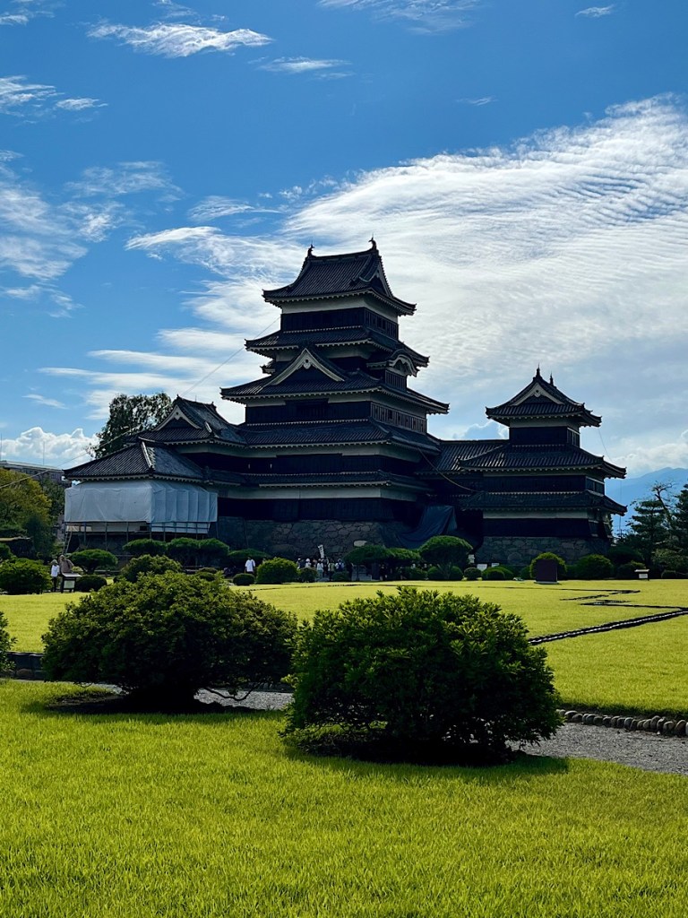 But at any rate, it was time for us to catch our train for Matsumoto and our evening’s accommodation in the suburb of Asama Onsen, famous for its natural hot springs (many ryokan, including some of those we stayed at, heat their water artificially). Enroute we detoured to Matsumoto-jo, the famous “crow castle” so named for its gleaming black-lacquered exterior. An early, small fort was built on the site in the Sengoku period, and then the Matsumoto clan expanded it to its current stature in the early Tokugawa period (1600s). The five-part keep or tenshukaku is original to the period and thus technically the oldest castle in Japan; most of the outer palaces burnt in one war or another and were rebuilt.
