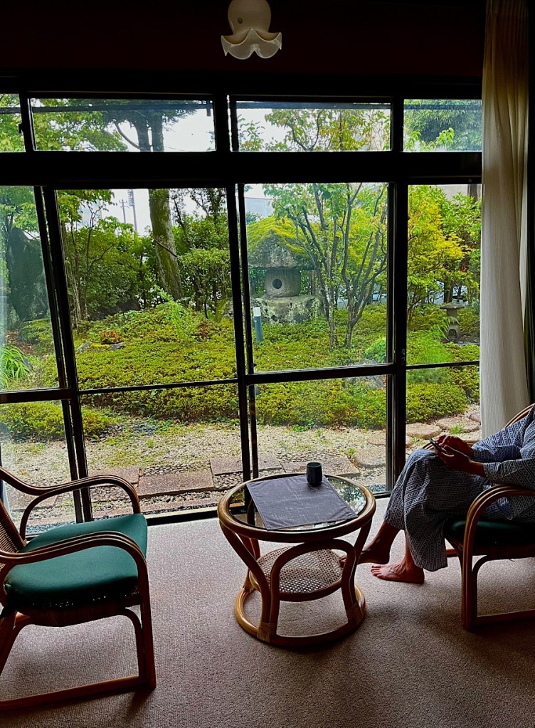 At this point we were ready to call it a day, so we caught our bus to Higashi Ishikawa–with the help of a friendly driver who corrected the directions we’d been given and saved us a 10-minute walk. The ryokan was possibly my favorite of the trip–small, family-run, and very traditional, with a stunning garden and simple, tranquil onsen. Dinner upstairs in the rustic bar area was delicious, featuring more Hida beef and fresh local mountain-vegetable tempura. As we slid open our shoji screens in our room, the promised rain began to fall (we narrowly missed a typhoon that curved away and hammered Tōkyo in our absence), and we fell asleep to the sound of it pattering on stone lanterns, ferns, and moss.