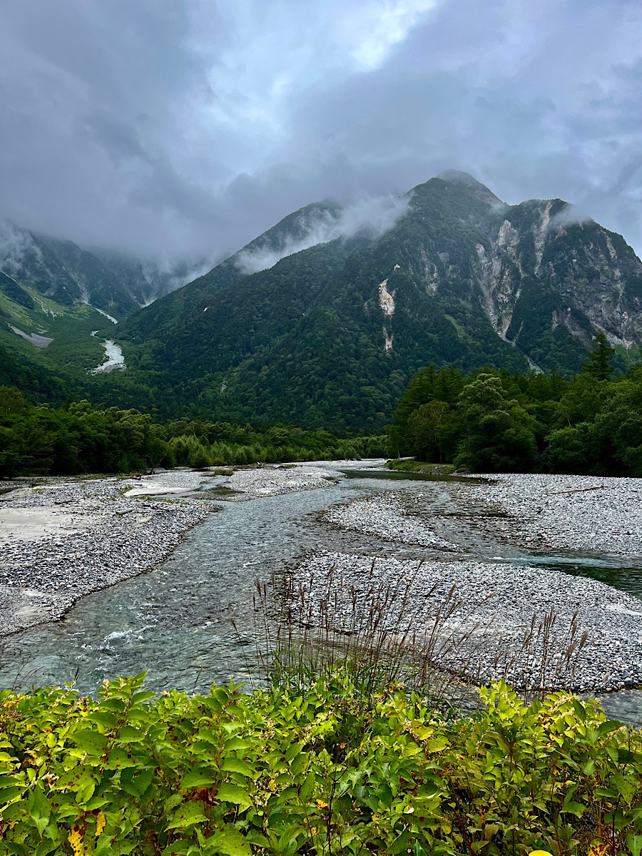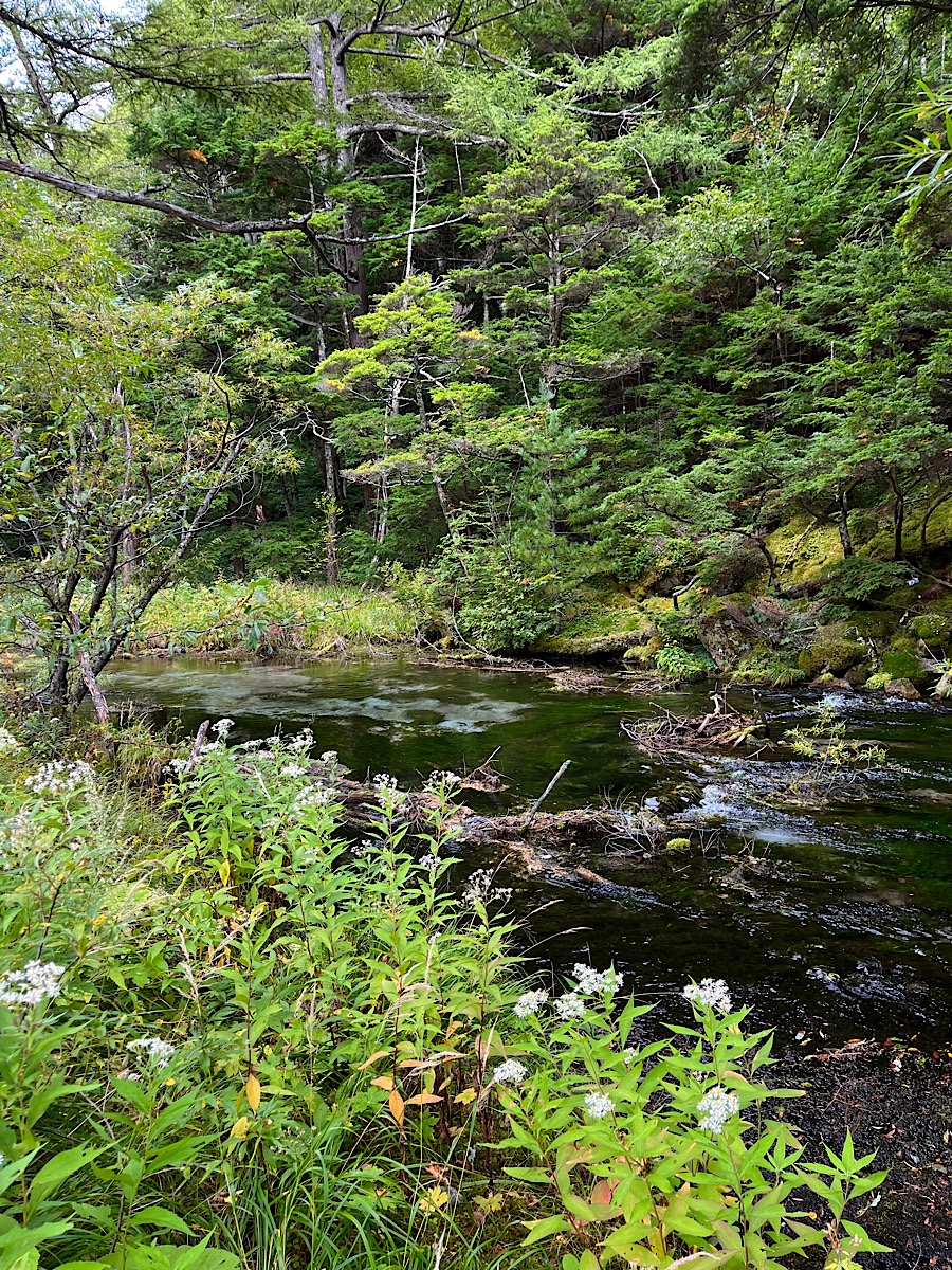 Under cool and cloudy skies, we started our walk from the picturesque Taisho-Ike, a pond affording excellent views of the volcanic Mt. Yake and Mt. Hotaka (with its remnant glacier). There are developed hiking paths to both peaks, and huts, but our itinerary tracked the glacial blue-green waters of the Azusa River as it meandered between broad, stony banks, spread out in lush marshes, and then rebraided itself into its course again. The path was pristinely maintained with kilometers of cedar boardwalks bridging over the marshier areas and charming runs of stepping-stumps in shorter sections, so it was easy, fast hiking in perfect conditions. We stopped for a quick snack of pork croquettes at Kappa-bashi, a bridge named for a Japanese trickster water-sprite whose concave head is filled with water it can’t lose without losing its powers, thus providing the humans it tries to beguile with some leverage to extract better behavior (kappas also apparently love cucumbers, so people throw cucumbers off bridges like this one to buy safe passage at night or in bad weather).